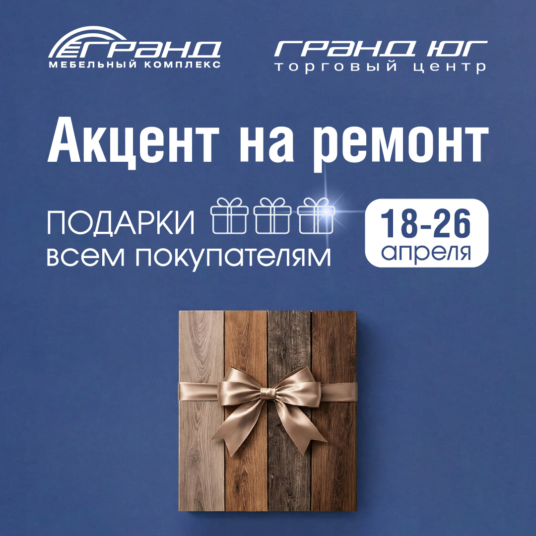 Приглашаем всех, кто начинает ремонт этой весной за покупками и подарками в мебельный комплекс «Гранд» и торговый центр «Гранд ЮГ»! С 18 по 26 апреля 2026 г. все покупатели в секциях «Товары для ремонта», «Сантехника», «Двери» смогут принять участие в беспроигрышном розыгрыше с ценными призами, а посетителей ждут скидки до 80%.
