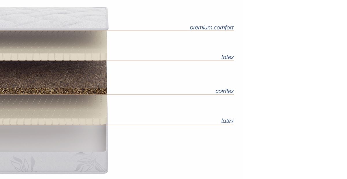 Coirflex – комфортный слой из натуральной кокосовой койры, пропитанный натуральным латексом (50% волокно кокосового ореха, 50% латекса). Гибкий и упругий, обладает ортопедическим эффектом и устойчив к нагрузкам. Придаёт жесткость матрасу.