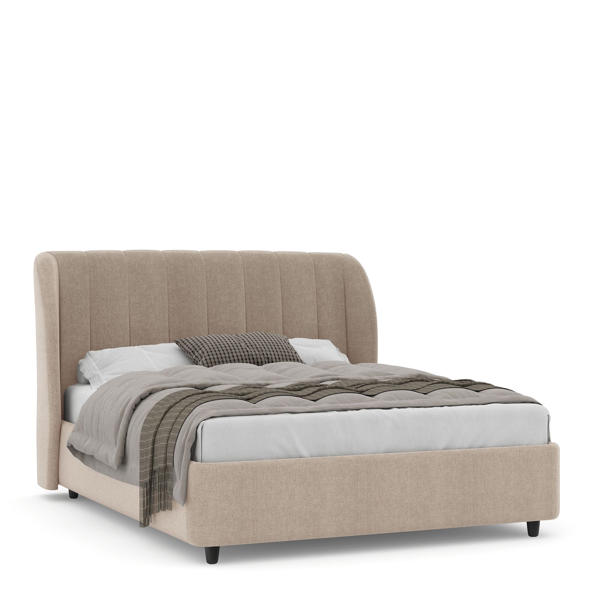 Двуспальная кровать NAPOLI в полностью мягком текстильном корпусе оснащена высоким изголовьем с «ушками», декорированным вертикальной прострочкой. Модель с надежным подъемным механизмом и вместительным ящиком для белья. Металлическое основание и ортопедическая решетка (каркас – металл) входят в комплектацию модели. Максимальная высота матраса – до 50 см. Высота ножек кровати – 10 см.