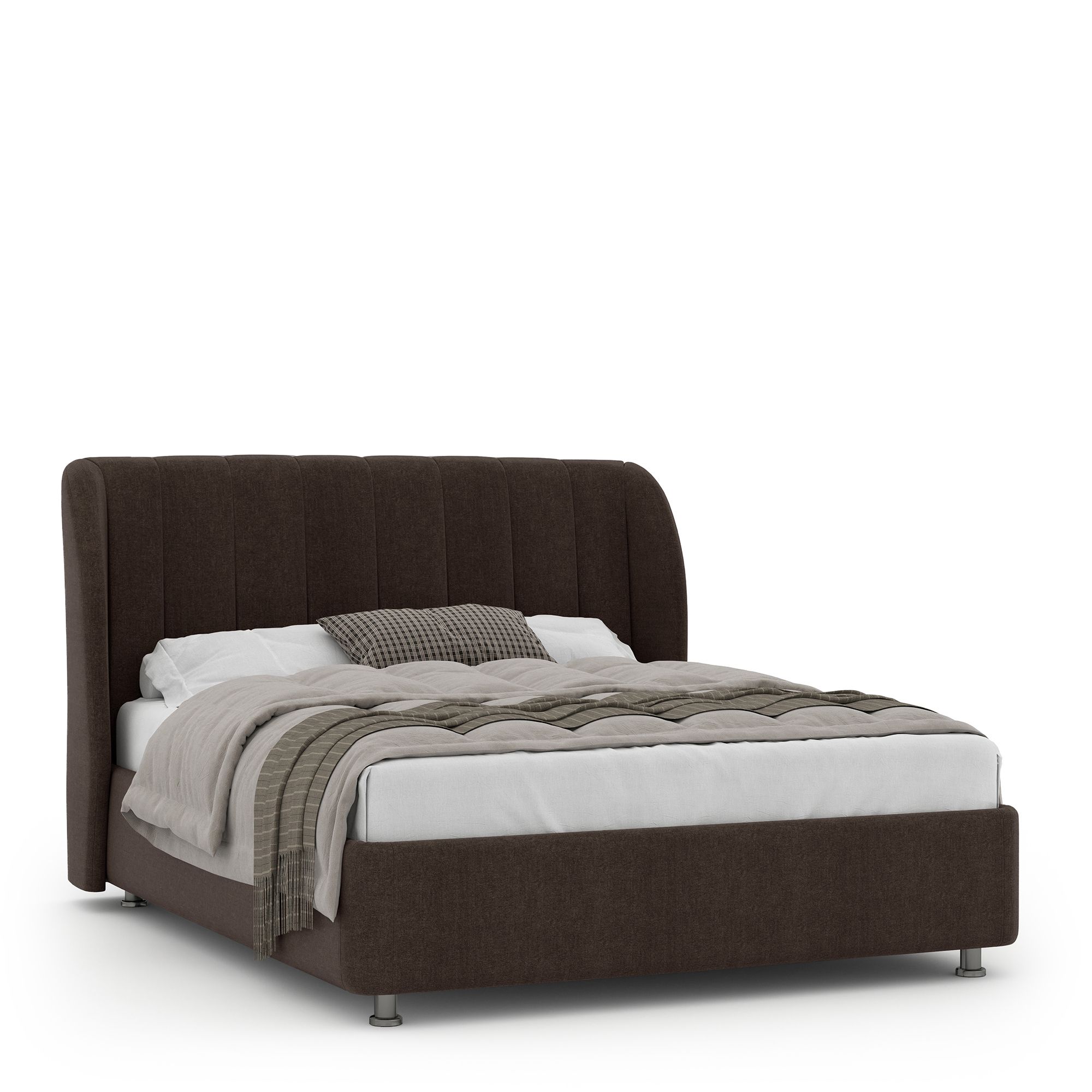 Двуспальная кровать NAPOLI в полностью мягком текстильном корпусе оснащена высоким изголовьем с «ушками», декорированным вертикальной прострочкой. Модель с надежным подъемным механизмом и вместительным ящиком для белья. Металлическое основание и ортопедическая решетка (каркас – металл) входят в комплектацию модели. Максимальная высота матраса – до 50 см. Высота ножек кровати – 10 см.
