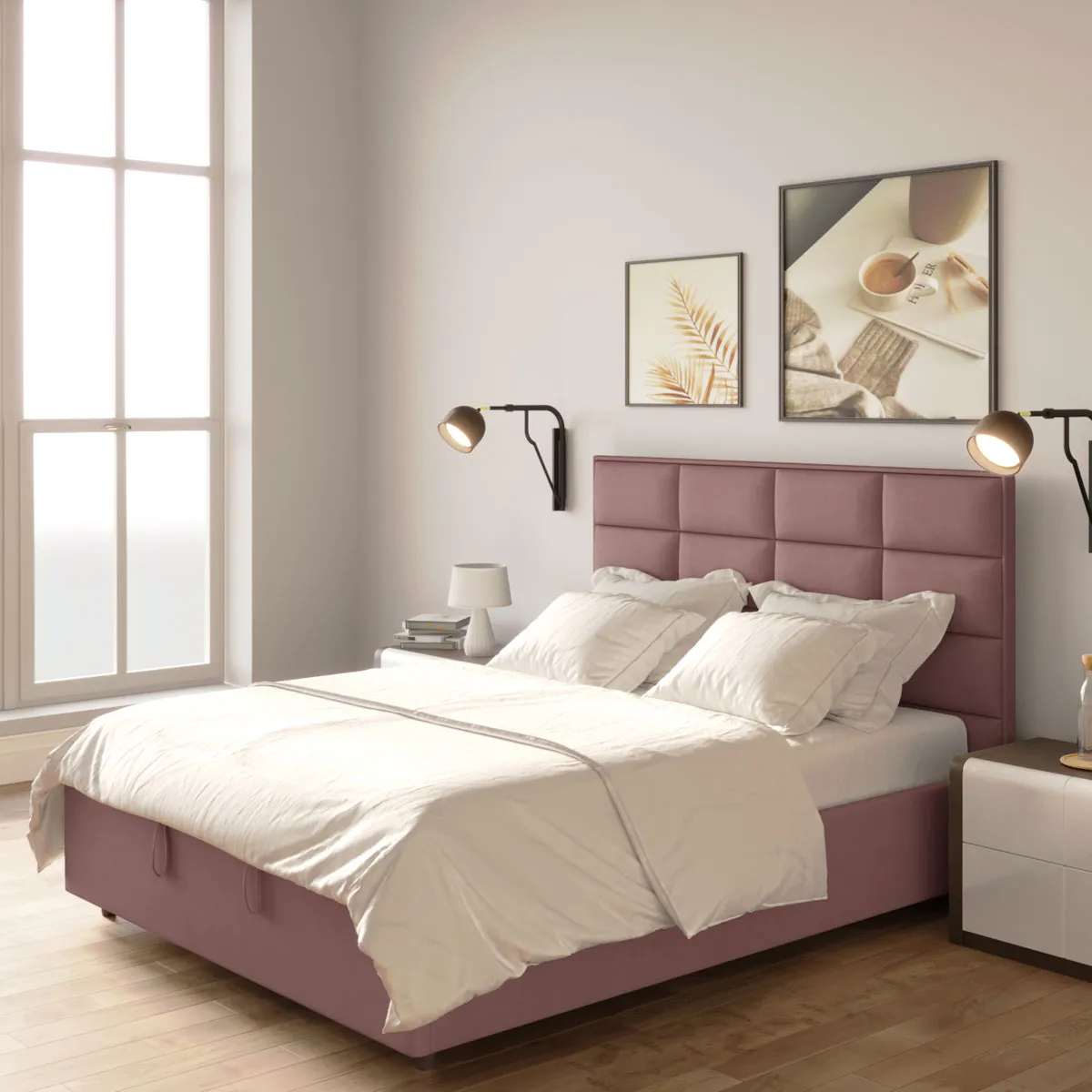 Передняя пласть изголовья декорирована мягкими объемными элементами прямоугольной формы. Тыльная сторона изголовья -технический спанбонд (нельзя использовать как разделитель пространства).