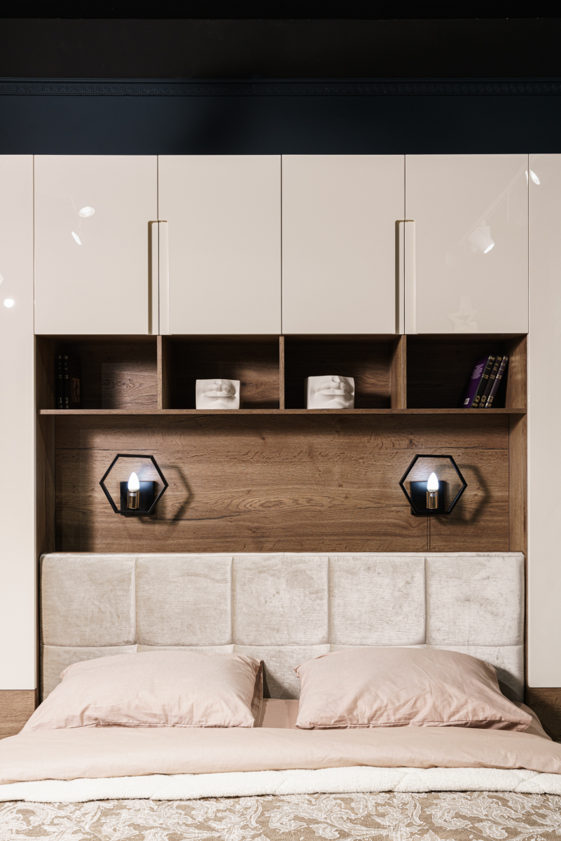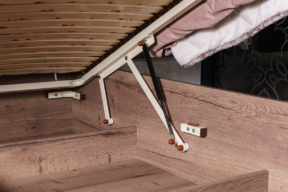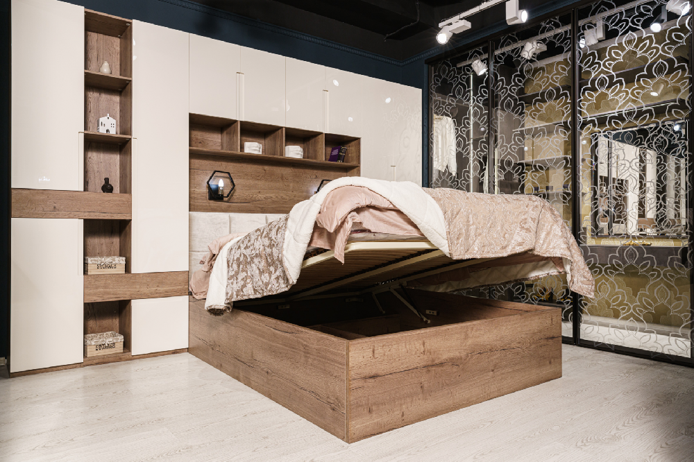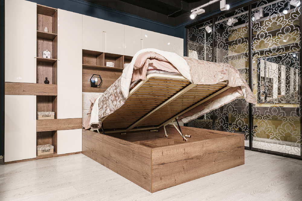 Кровать с подъемным механизмом и мягким изголовьем (элементом)