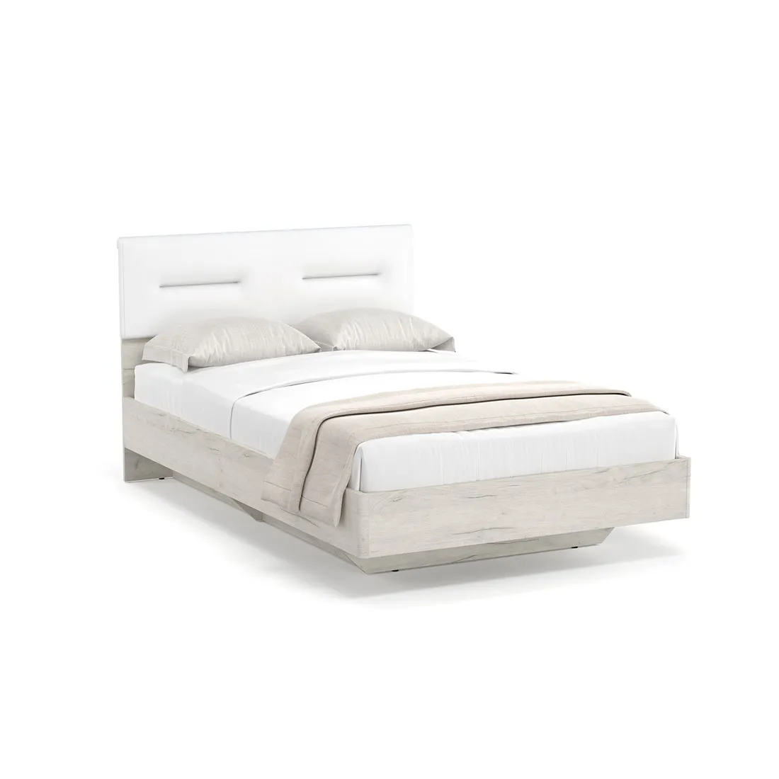 Двуспальная кровать с ящиком для белья Наполи изготовлена из высококачественного ЛДСП в натуральном декоре «дуб Крафт белый» с мягким изголовьем из экокожи белого цвета.