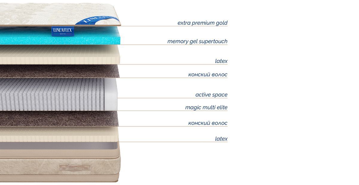Memory Gel Supertouch – экстраэластичная пена, которая запоминает и повторяет форму тела с точностью до миллиметра. В состав пены включен специальный гель, который реагирует на температуру тела и обеспечивает повышенную терморегуляцию, обладает охлаждающими свойствами, создает и сохраняет эффект прохладной поверхности на протяжении всей ночи / времени отдыха, но не переохлаждает.Latex – премиальный, долговечный наполнитель, изготовленный из сока каучукового дерева гевеи. Материал натуральный, имеет пористую структуру, благодаря которой создаётся идеальная вентиляция матраса и не развивается бактериальная флора. Обладает ортопедическим эффектом – упругий и эластичный, позволяет позвоночнику принимать физиологически правильное положение.