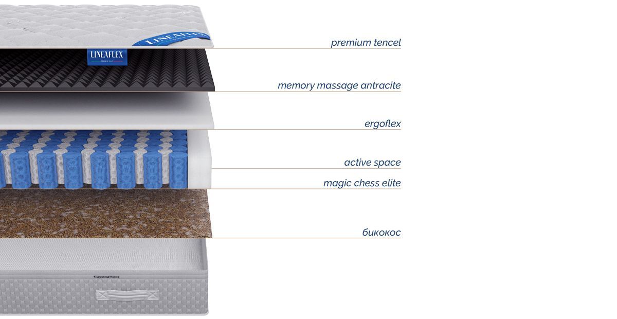 Juventus Active - это эргономичный односторонний матрас. В его основе лежит пружинный блок INTERACTIVE. Опорная поверхность матраса выполнена из износостойкого, экологического материала би кокос. ТОП матраса: высокоэластичная пена ERGOFLEX 3 см., MEMORY NATURALIS anthracite с добавками угля и микромассажным эффектом. ТENCELfresh – уникальная система комфорта, используемая в односторонних матрасах.