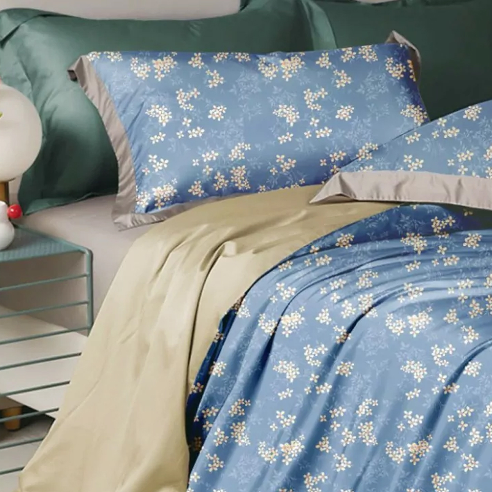 КПБ, Евро, печатный сатин, бежевый/синий, Asabella