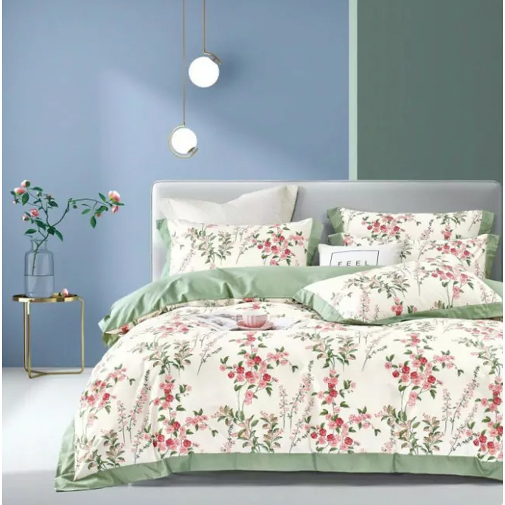 КПБ, Евро, печатный сатин, белый/зеленый/розовый/сливочный, Asabella