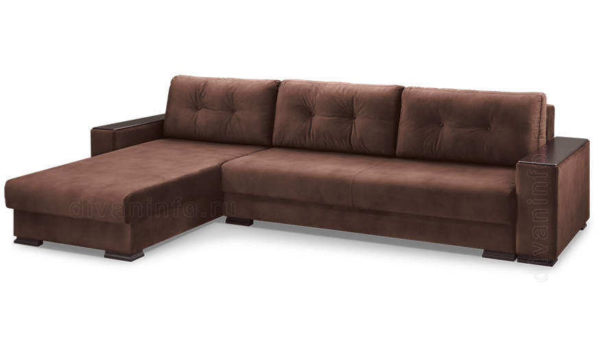 Благодаря большим габаритным размерам и наличию выступающей угловой части на диване удобной отдыхать как сидя, так и лежа. Три большие мягкие подушки, декорированные пуговицами, хорошо поддерживают спину, делая отдых максимально комфортным. На широкие подлокотники с деревянными накладками удобно ставить чашки, на них также можно расположить предметы, которые хотелось бы держать под рукой.