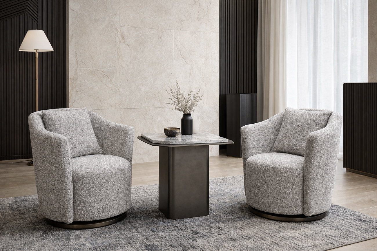 Кресло Верона(Verona) — изящное воплощение уюта и современной элегантности. Вращающаяся конструкция на бронзовом основании обеспечивает комфорт в движении, а мягкое серое букле с благородной фактурой подчёркивает премиальность модели. Эргономичная спинка ...