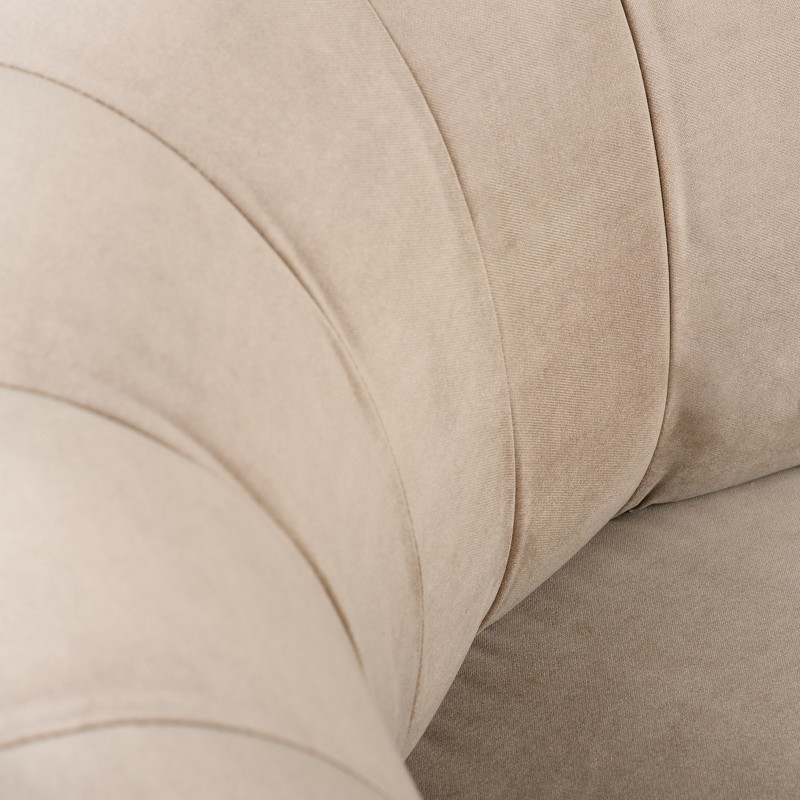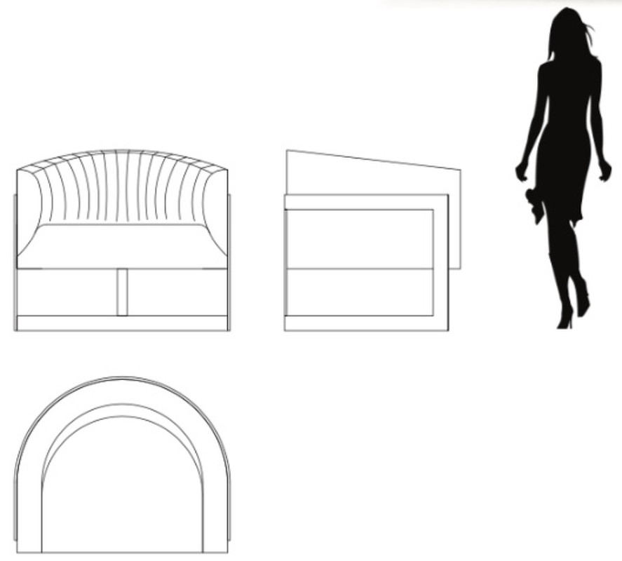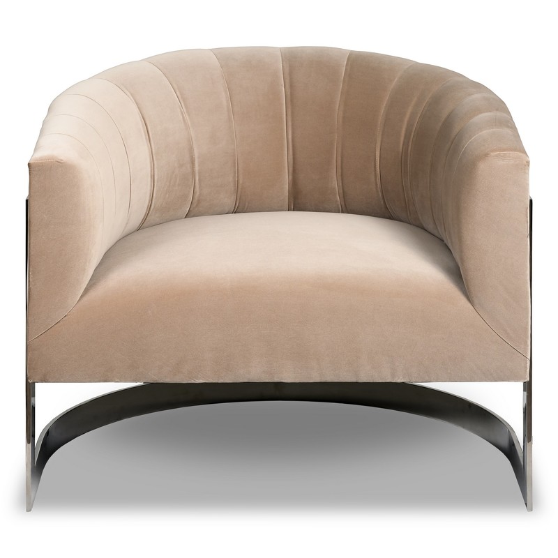 Кресло выполнено в стиле ар-деко. Спинка декорирована вертикальной стежкой. Каркас изготовлен из массива бука. Сидение на эластичных ремнях, наполнитель пенополиуретан. Ножки выполнены из нержавеющей стали с хромированным покрытием.