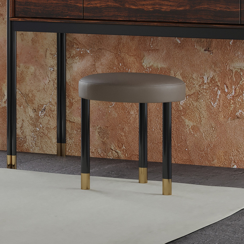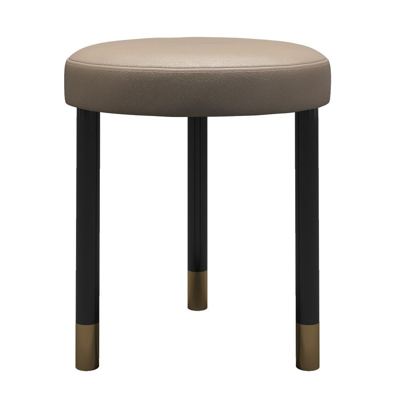 Сидение пуфика выполнено из массива дерева. Металлические ножки в черном матовом лаке, детали в цвете латунь. Обивка - эко-кожа в бежевых тонах. Наполнитель сидения - пенополиуретан высокой плотности.