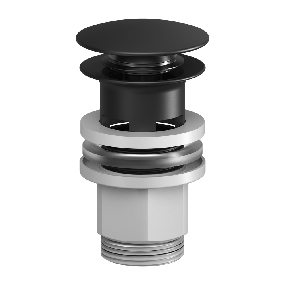 Система клик-клак управляется нажатием на пробку слива. Покрытие устойчиво к коррозии появлению царапин сколов и потускнению. Круглая заглушка черного матового цвета.