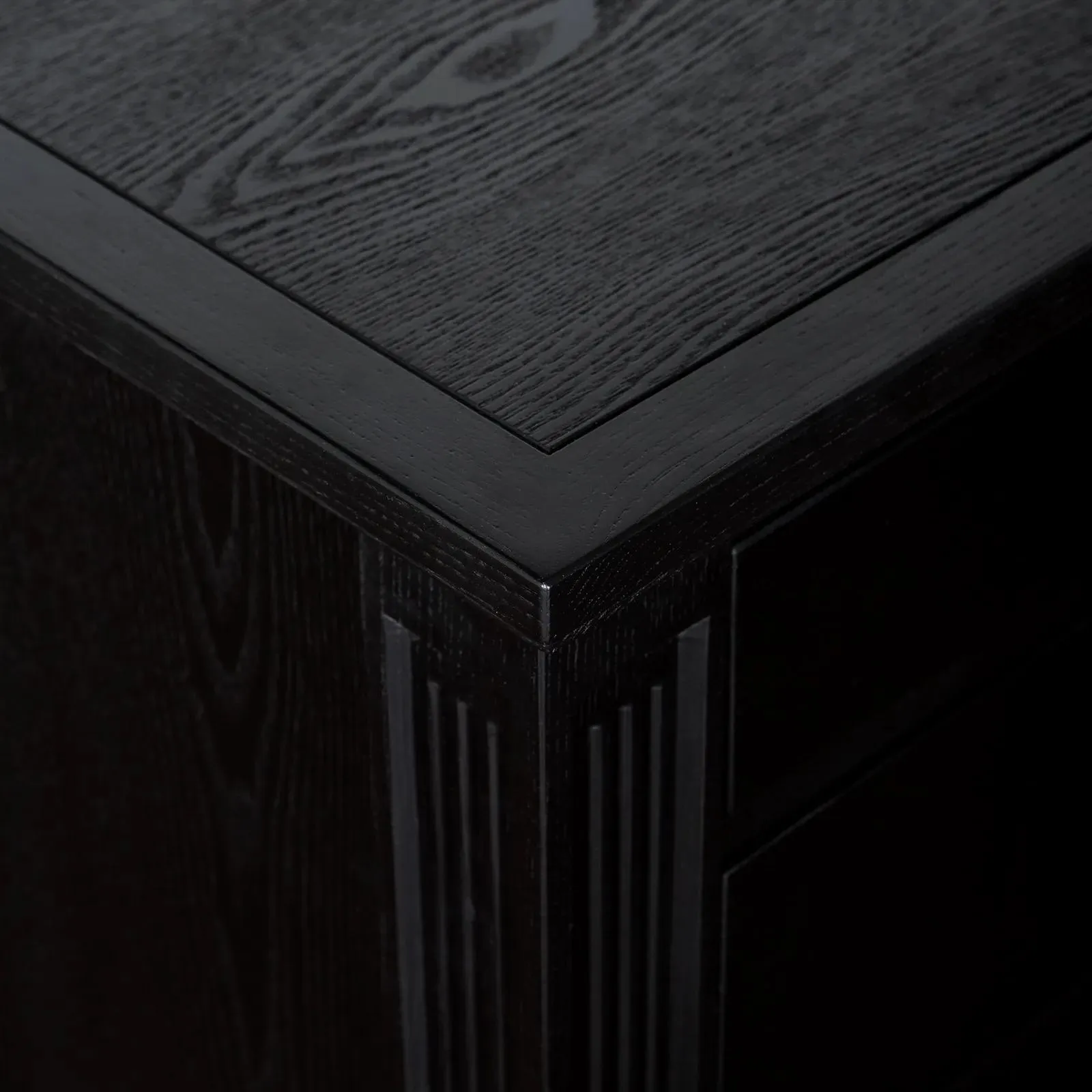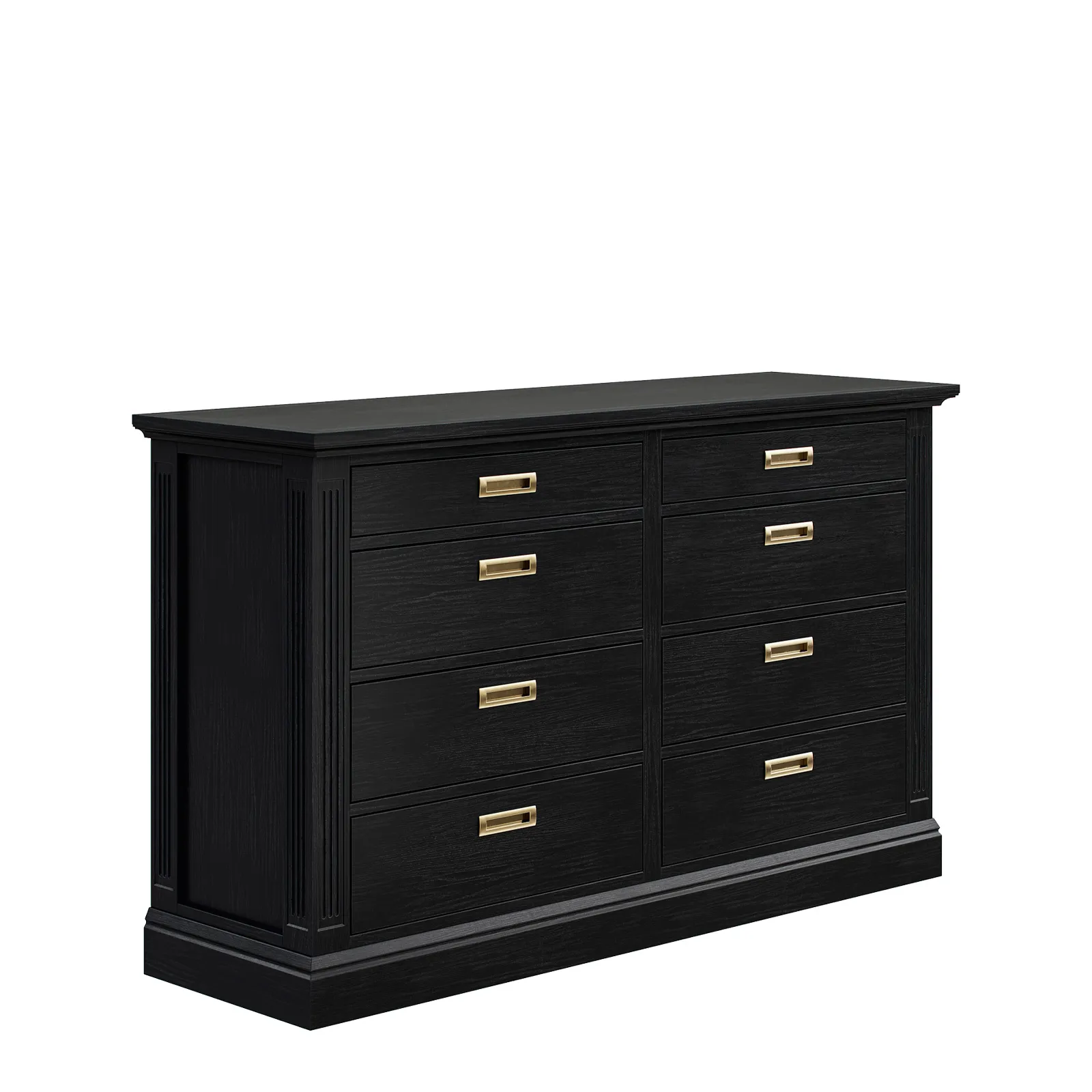 Комод с 8-ю выдвижными ящиками выполнен из шпона вяза, оснащен доводчиками, выкрашен в морилку черного цвета с сохранением фактуры дерева.