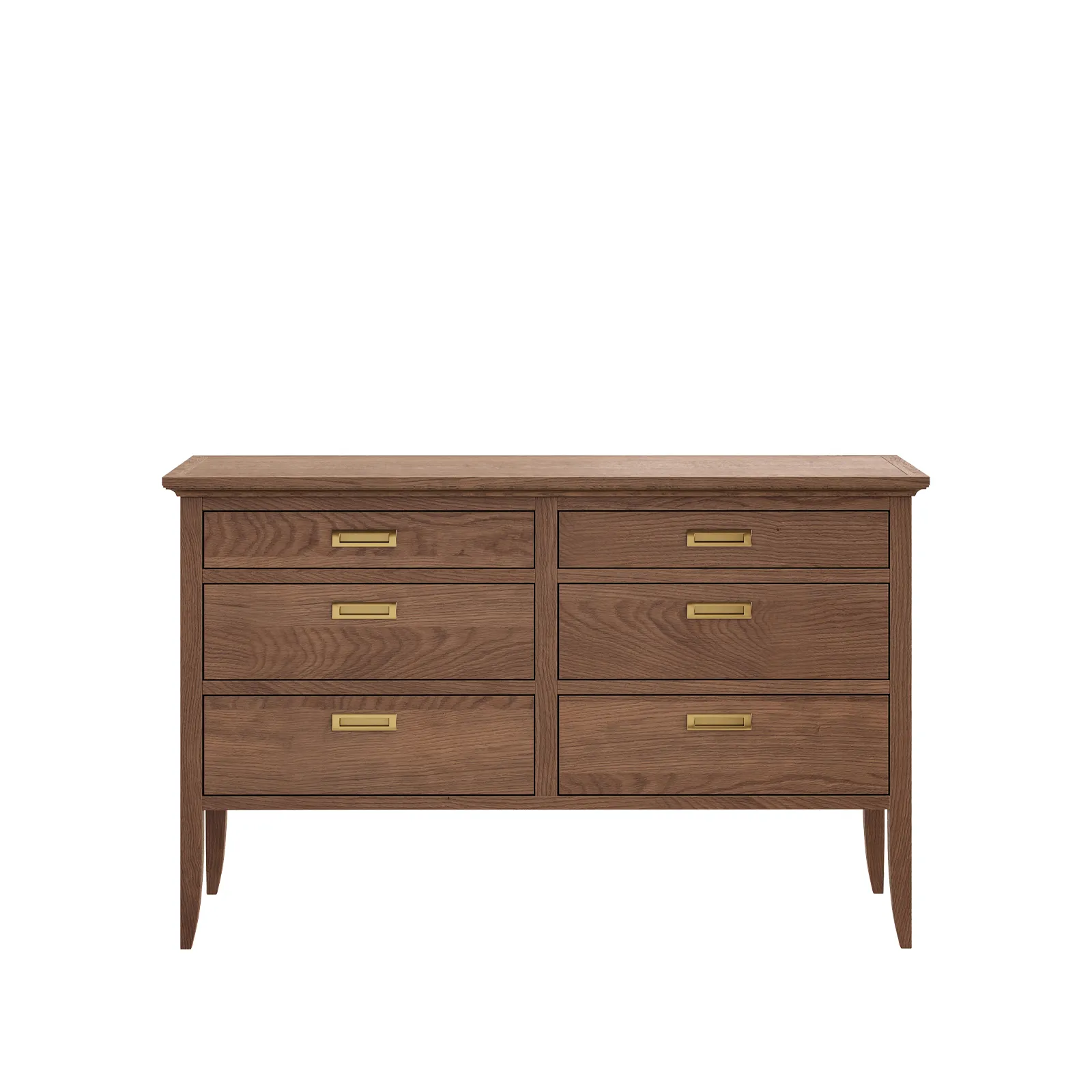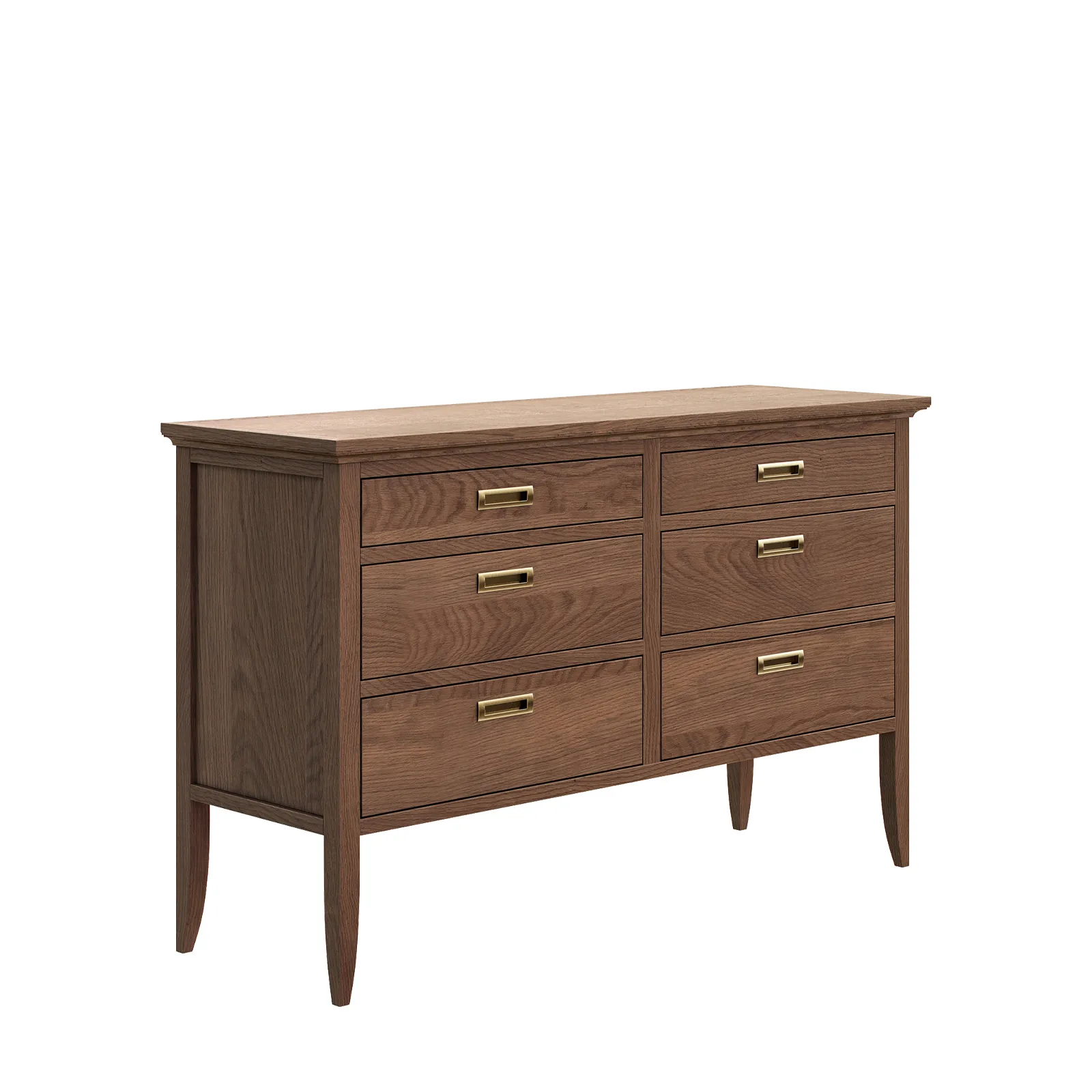 Комод с 6-ю выдвижными ящиками выполнен из шпона вяза, оснащен доводчиками, выкрашен в морилку с сохранением фактуры дерева.