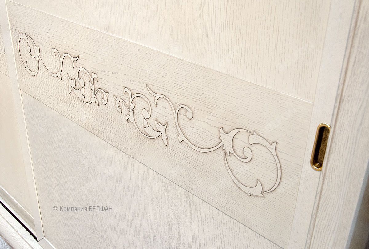 ? Изюминку дизайну шкафа придает резной орнамент на фасаде раздвижных дверей.