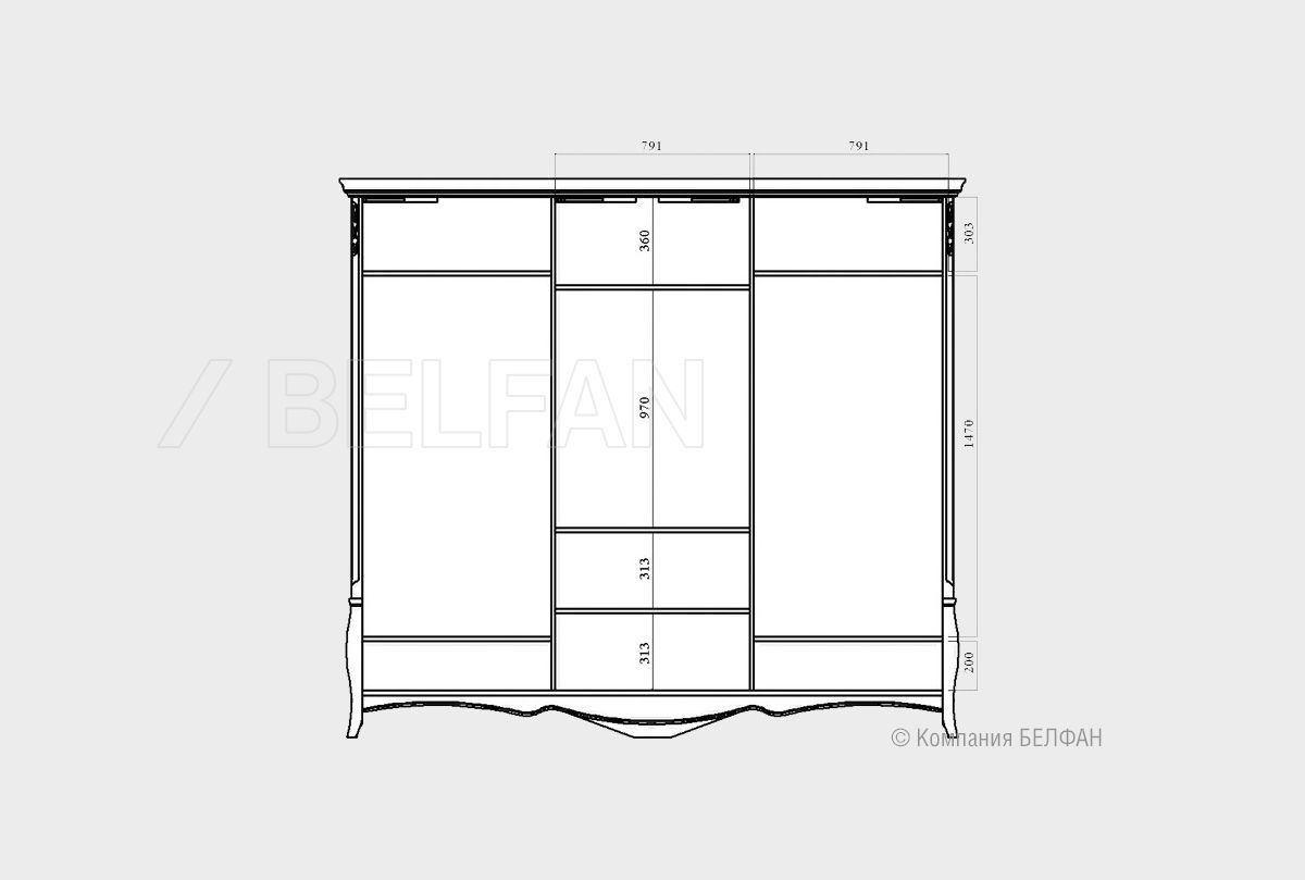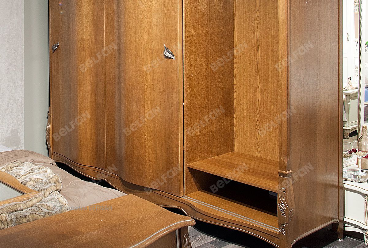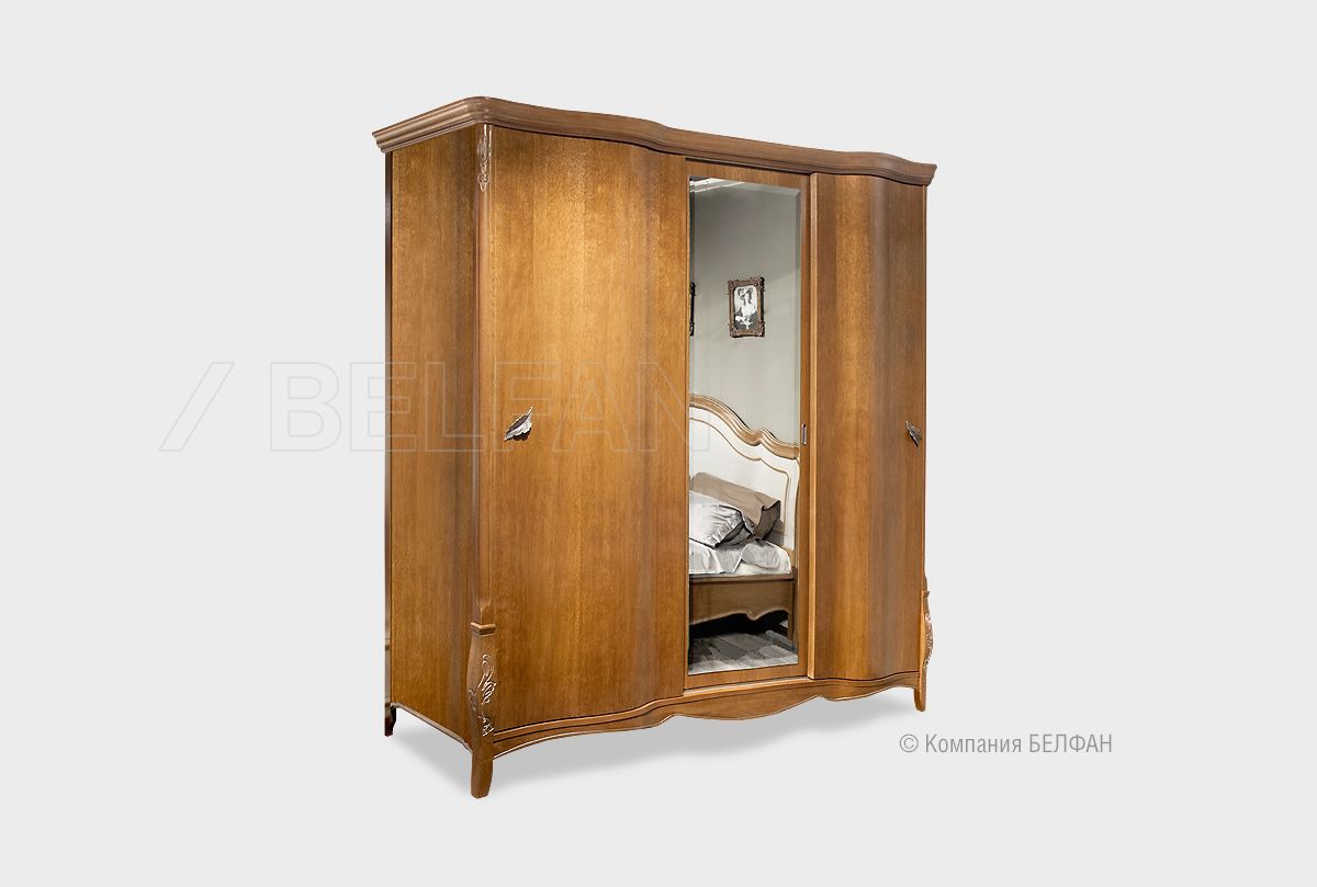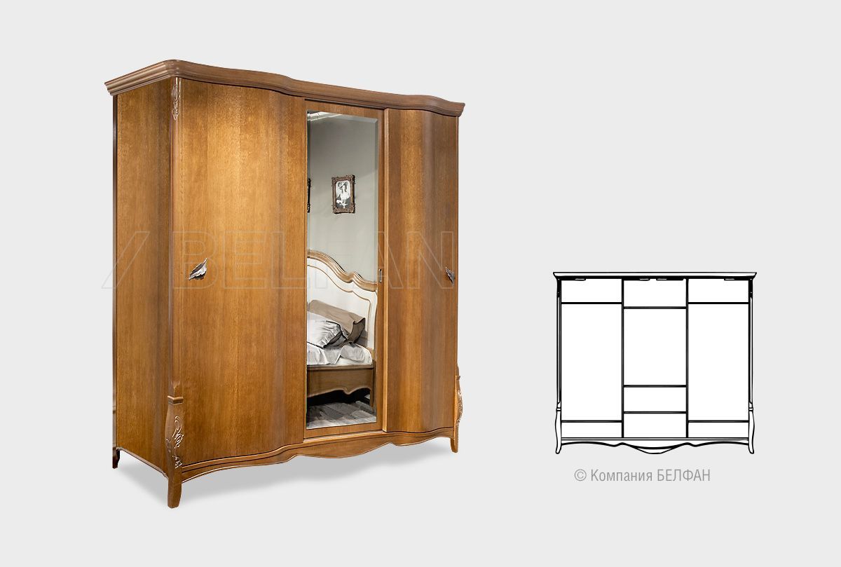 Благодаря своим размерам шкаф-купе из коллекции «Трио» позволит разместить гардероб всей семьи. В боковых секциях расположены две полки и штанги для одежды, куда можно повесить платья, костюмы и длинную верхнюю одежду, а в центральной – штанга для плечиков и три полки, на которых Вы сможете сложить футболки, джемпера и джинсы. Бесшумные двери-купе делают этот шкаф идеальным для спальни: ни один шум не разбудит Вас утром. Несмотря на свои внушительные размеры, этот шкаф Trio выглядит изящно и утонченно благодаря волнистой «юбке» и фурнитуре в виде лепестков. Благородные оттенки крашения «коньяк с серебряной патиной», «белая эмаль с золотой патиной» и «белая эмаль с серебряной патиной» гармонично дополняют «образ» и делают это изделие универсальным и подходящим практически к любому интерьеру.
