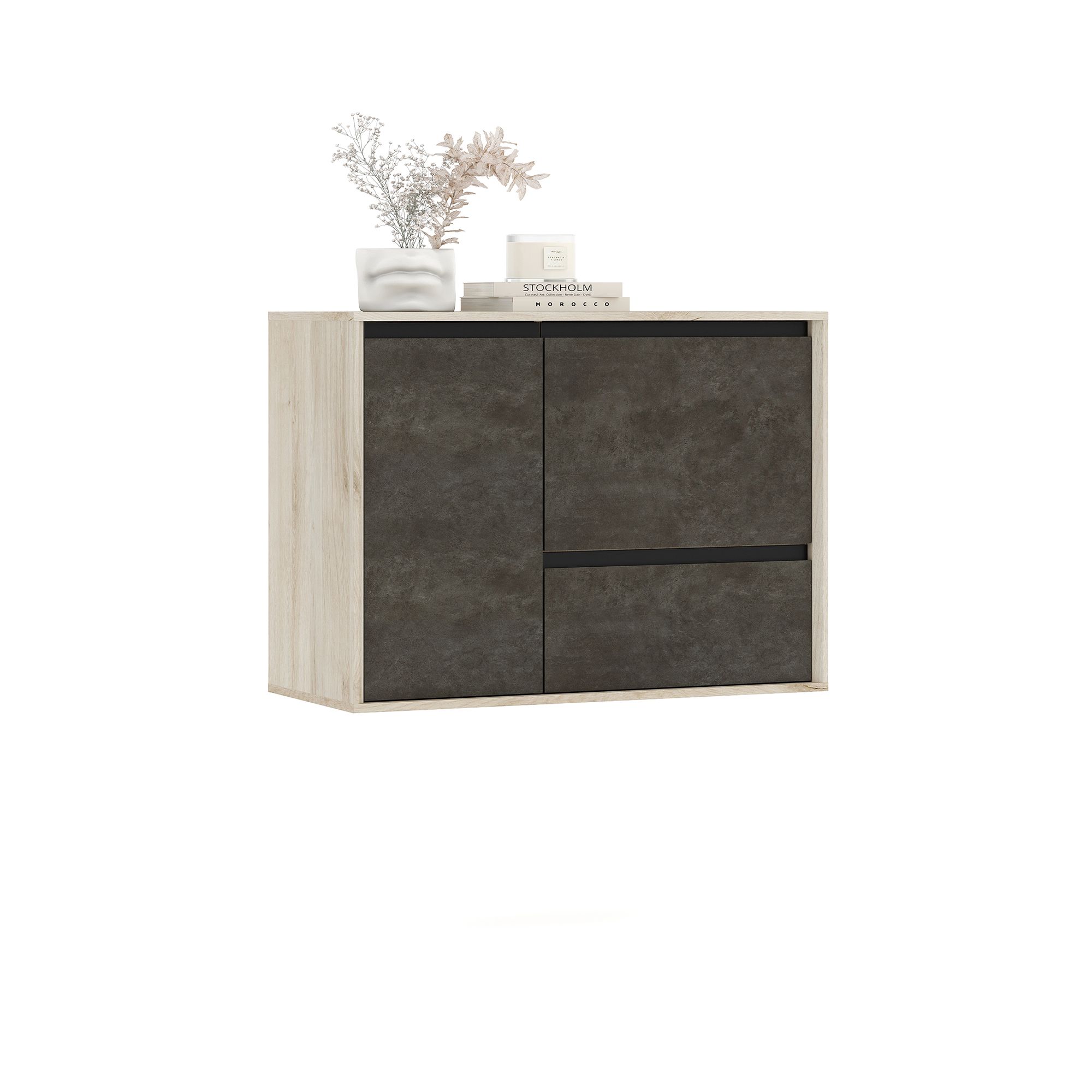Навесной шкаф LUNA глубиной 42,5 см и шириной 95,1 см с корпусом в текстуре Дуб Anziano оснащен выдвижным ящиком и двумя распашными фасадами с интегрированными J-ручками. За одним из фасадов расположена полка из ЛДСП. Элемент имеет как правое, так и левое исполнение.