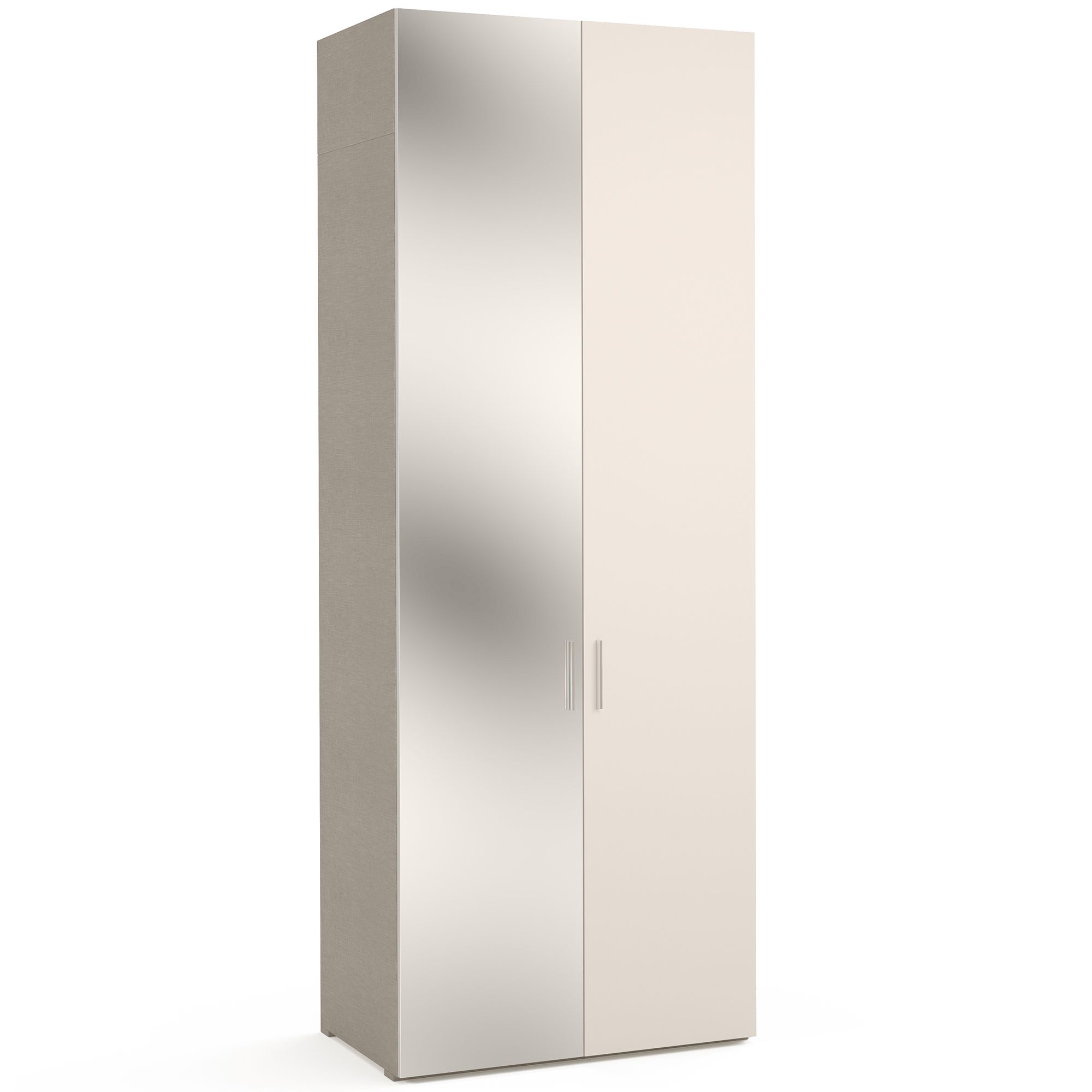 Двухдверный шкаф ESTE оснащен антресолями, увеличивающими его высоту, что позволяет использовать по максимуму свободное пространство под потолком. Один из фасадов шкафа выполнен в отделке Cashmere матовый, второй представляет собой сплошное зеркальное полотно. Внутреннее пространство оформлено в текстуре Шенилл, воспроизводящей рисунок плетения натуральной ткани. Наполнение шкафа представляет собой систему из трех полок, к нижней из которых крепится штанга для вешалок. Шкаф оснащен встроенным светильником, который включается автоматически при открывании дверей (система включения светильника с трансформатором заказываются отдельно). В комплектацию включены ручки в отделке Хром-глянец. Предусмотрена возможность замены на ручки в отделке Черный никель. ВАЖНО! Глубина шкафа указана без учета фасада, высота – без учета карниза. Боковые стенки и карнизы заказываются отдельно. Зеркальный фасад поставляется с двумя сквозными отверстиями под ручку.