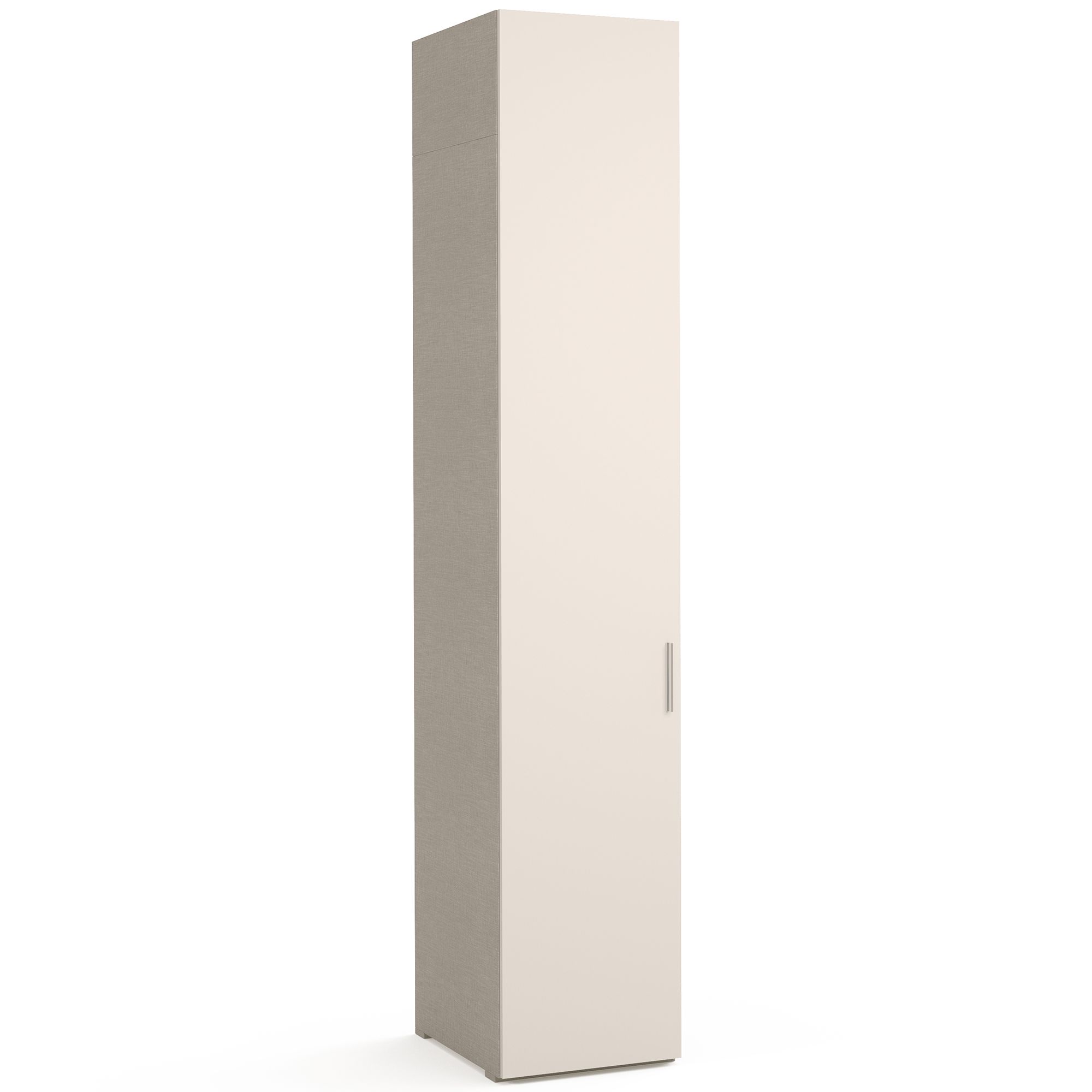 Однодверный шкаф ESTE оснащен антресолями, увеличивающими его высоту, что позволяет использовать по максимуму свободное пространство под потолком. Фасад шкафа выполнен в отделке Cashmere матовый. Внутреннее пространство оформлено в текстуре Шенилл, воспроизводящей рисунок плетения натуральной ткани. Наполнение шкафа представляет собой систему из трех полок, к нижней из которых крепится штанга для вешалок. В комплектацию включены ручки в отделке Хром-глянец. Предусмотрена возможность замены на ручки в отделке Черный никель. ВАЖНО! Глубина шкафа указана без учета фасада, высота – без учета карниза. Боковые стенки и карнизы заказываются отдельно.