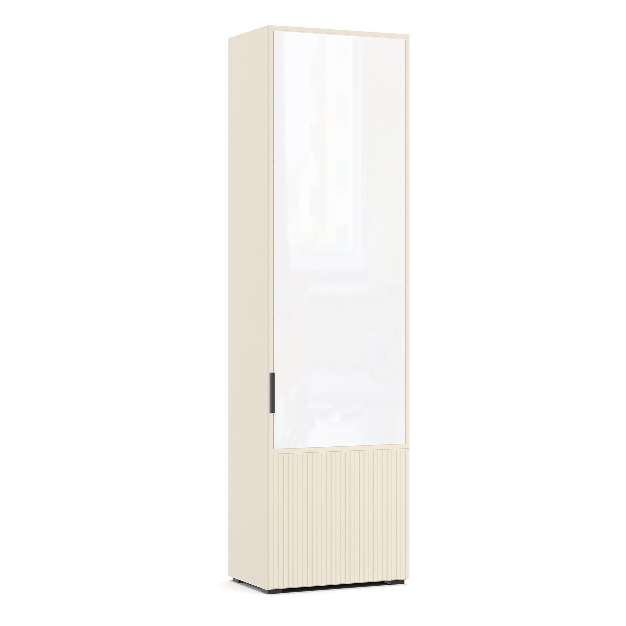 Внутреннее наполнение однодверного шкафа NAPOLI представляет собой систему из двух полок, к верхней из которых прикреплена поперечная штанга для вешалок. Верхняя часть фасада оснащена зеркалом, нижняя декорирована вертикальной фрезеровкой. Предусмотрены варианты с левым и правым открыванием фасада.