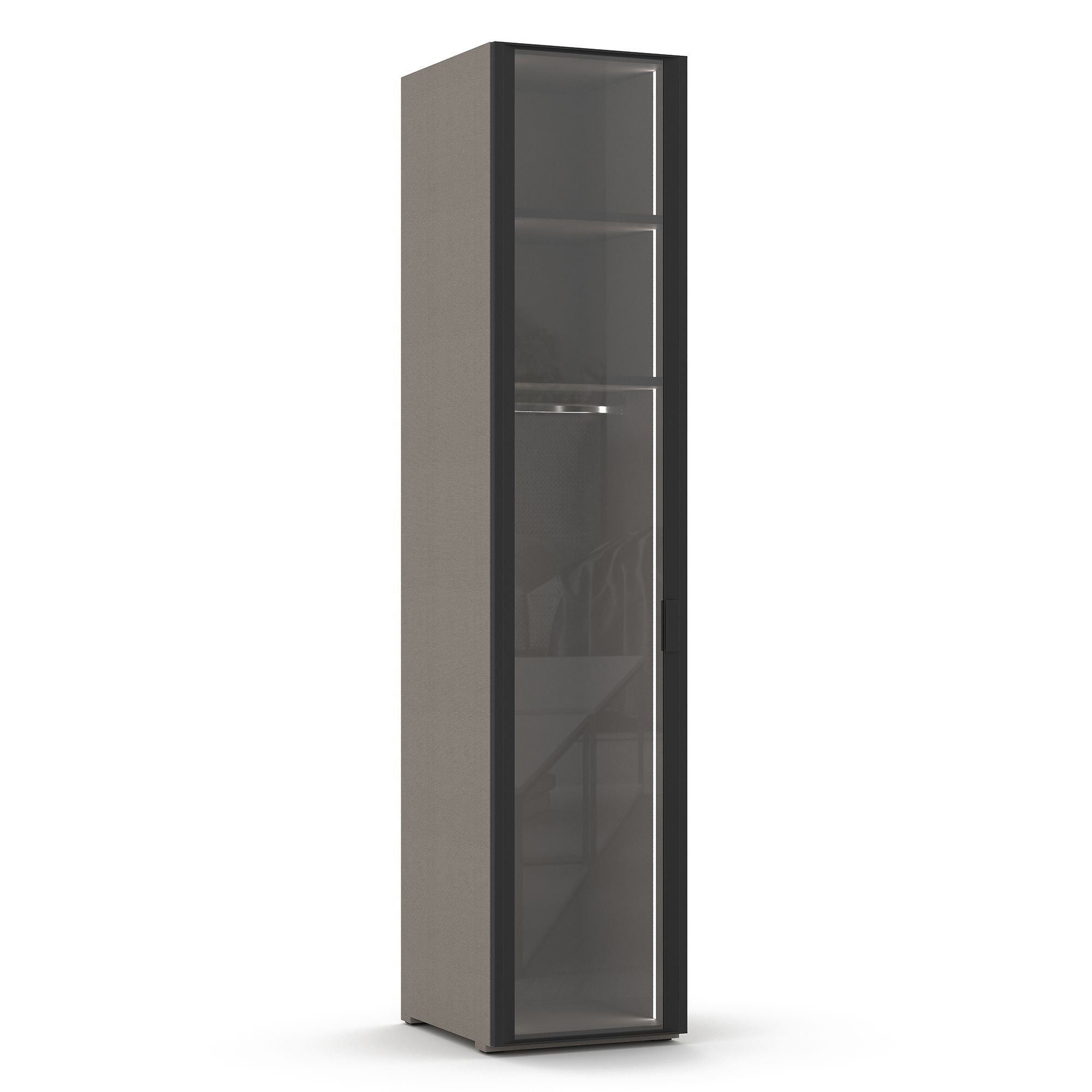 Однодверный шкаф TERAMO оснащен распашным фасадом, представляющим собой металлическую раму в отделке Черный матовый с тонированным стеклом, обладающим зеркальным эффектом. Внутреннее наполнение шкафа представляет собой две полки из ЛДСП, в нижней из которых крепится штанга для вешалок. Предусмотрены варианты как с правым, так и с левым открыванием. Накладные ручки из алюминия с черным матовым покрытием и система подсветки (2 светильника) входят в комплектацию. ВАЖНО! Система включения-выключения встроенной подсветки заказывается отдельно. Для подсветки, установленной в этой модели, необходима система, обладающая достаточной мощностью.