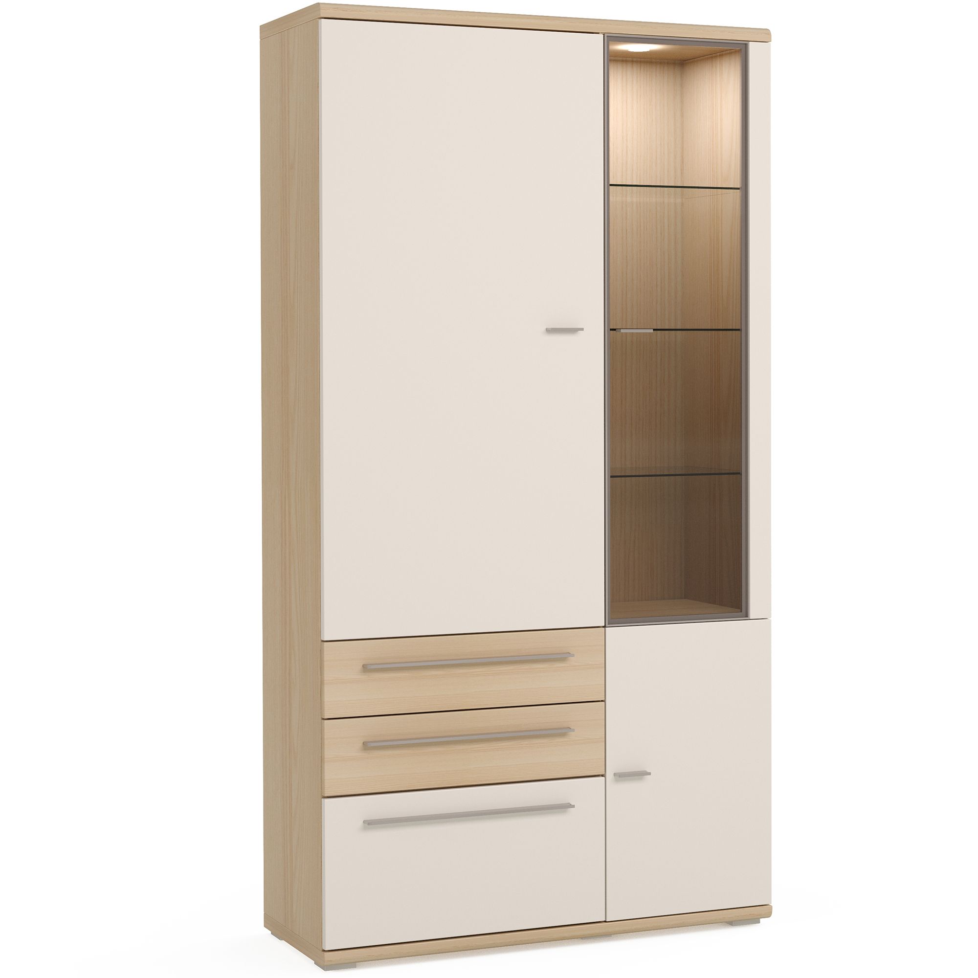 Вместительный шкаф ESTE оснащен распашными фасадами и выдвижными ящиками. За закаленным тонированным стеклом расположены стеклянные полки и система внутренней подсветки.
