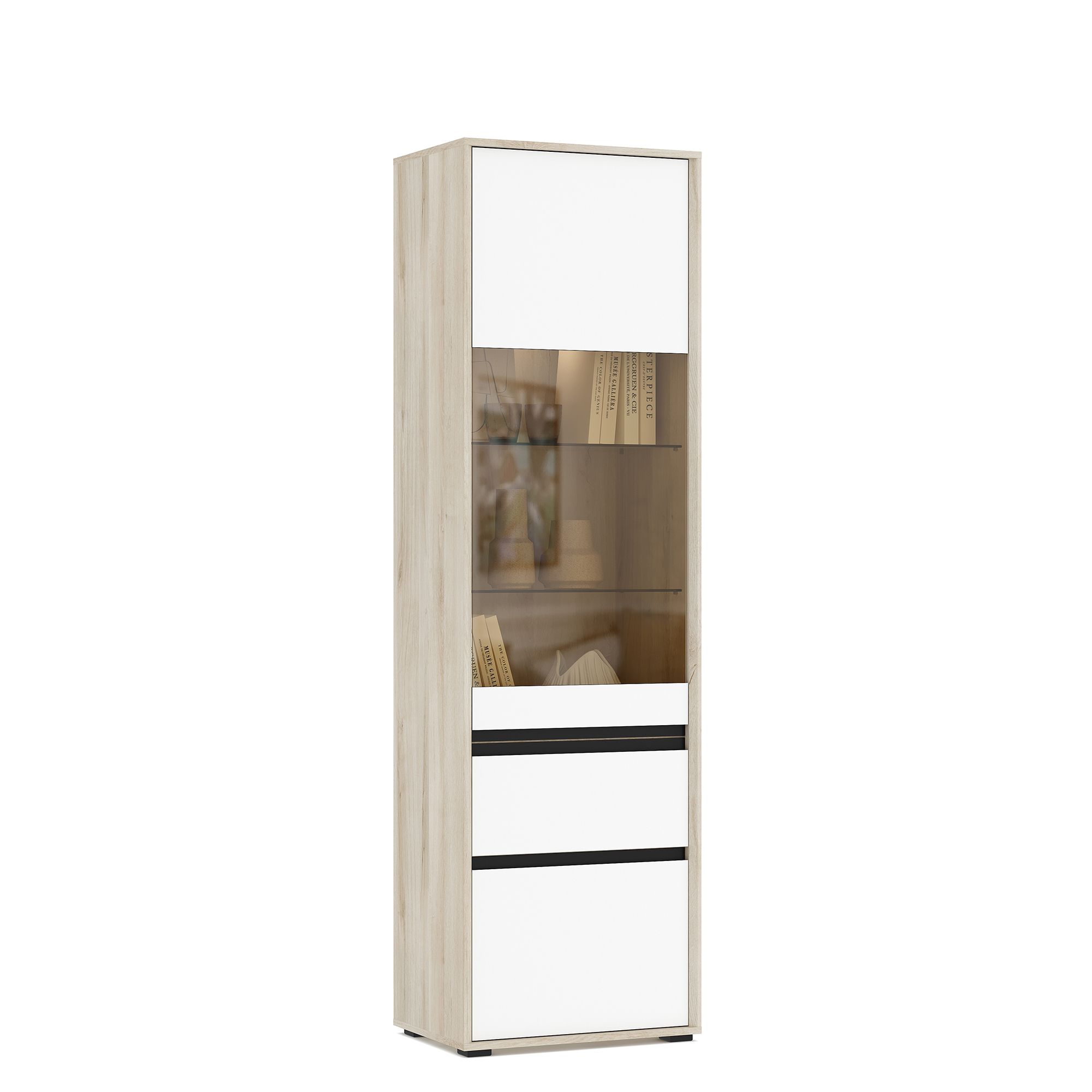 Шкаф-витрина LUNA высотой 206,8 см и шириной 60,1 см с корпусом в текстуре Дуб Anziano оснащен выдвижным ящиком и распашными фасадами с интегрированными J-ручками. За вставкой из тонированного стекла располагаются стеклянные полки, за сплошным фасадом – полки из ЛДСП. Возможно как левое, так и правое исполнение элемента. В качестве опции доступна система подсветки (заказывается отдельно).