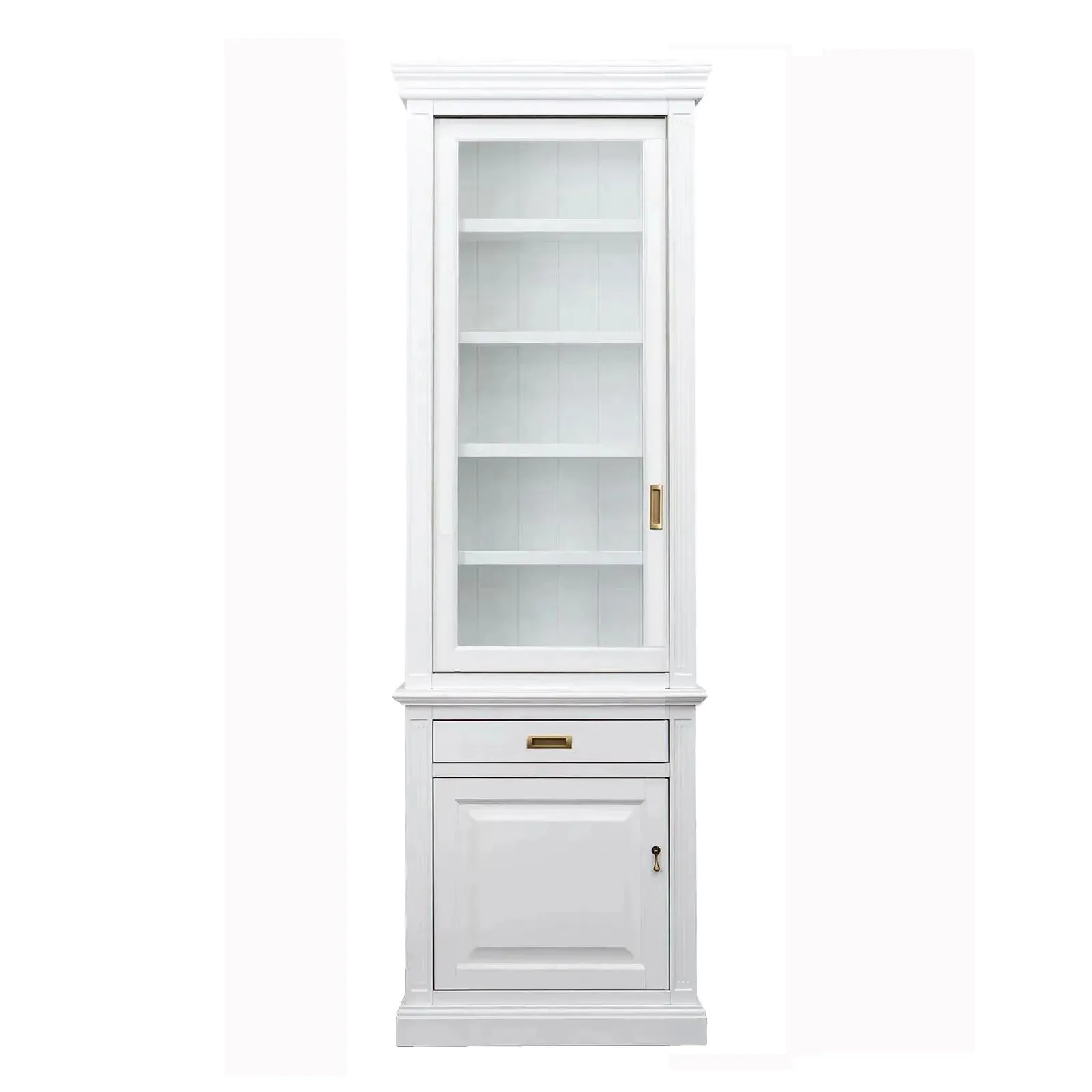 Узкая односекционная витрина с распашной дверкой (левое и правое открывание) выполнена из массива вяза и шпона ясеня, в эмали белого цвета с фактурой дерева.