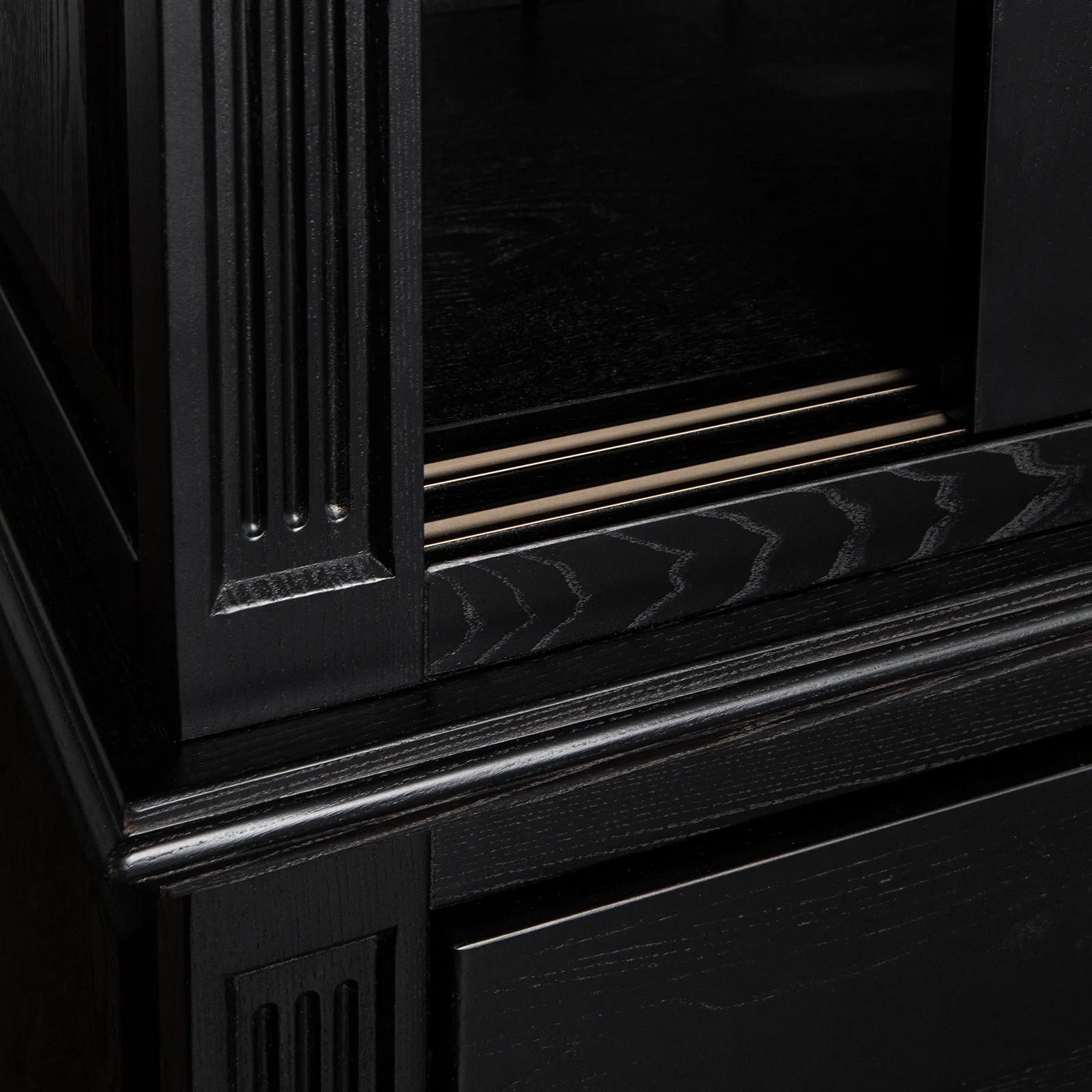 Двухсекционная витрина с откатными дверцами выполнена из массива березы (гладкая фактура) или шпона ясеня (с фактурой дерева), комбинированный выкрас в эмали черного или белого цвета.
