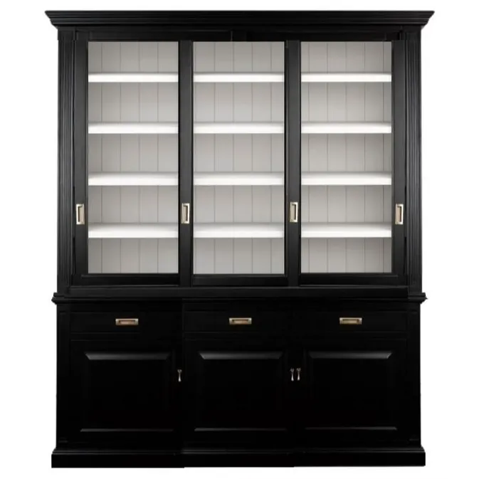 Трехсекционная витрина с откатными дверцами выполнена из массива вяза и шпона вяза, выкрашена в морилку цвета "орех" с сохранением фактуры дерева.
