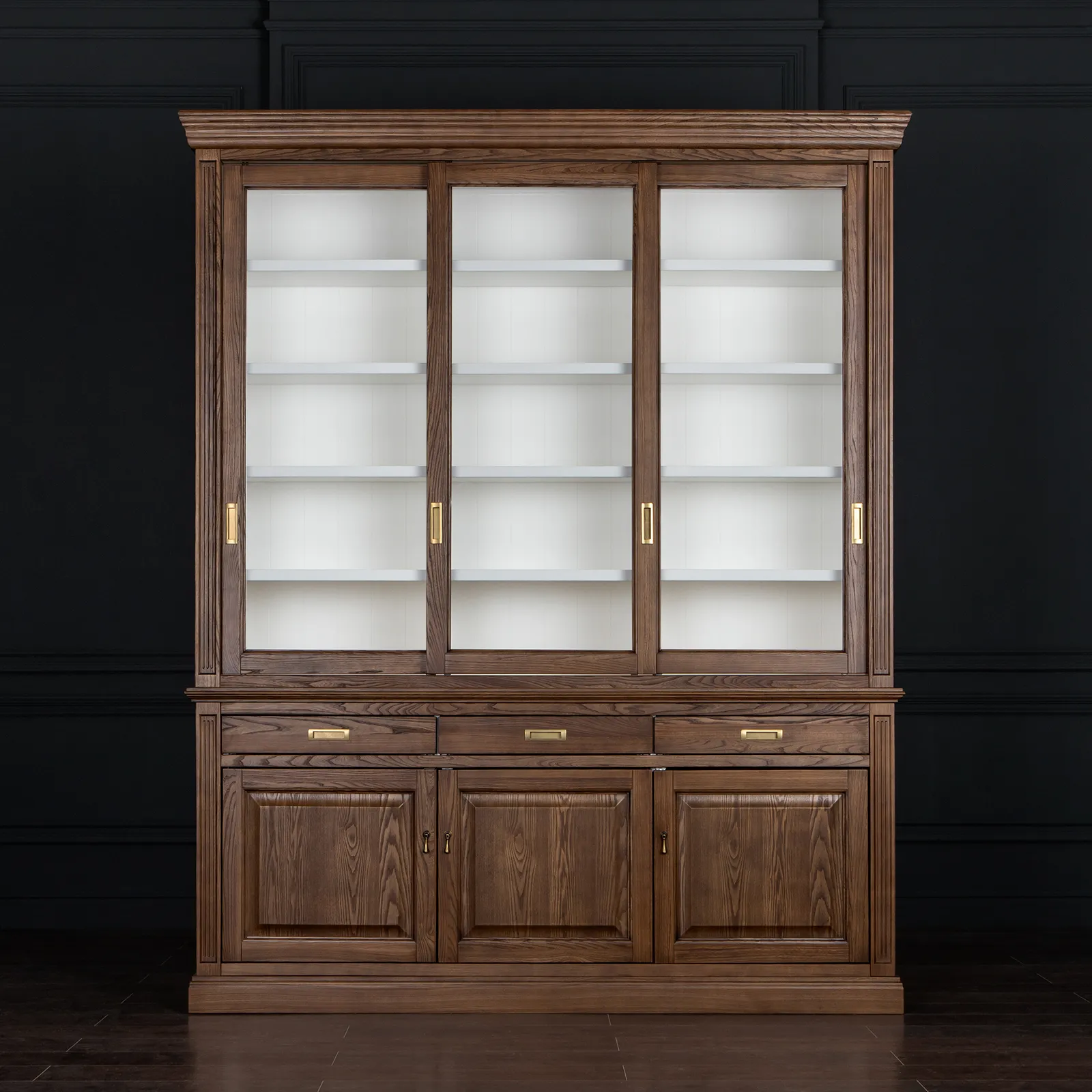 Трехсекционная витрина с откатными дверцами выполнена из массива вяза и шпона вяза, выкрашена в морилку цвета "орех" с сохранением фактуры дерева.