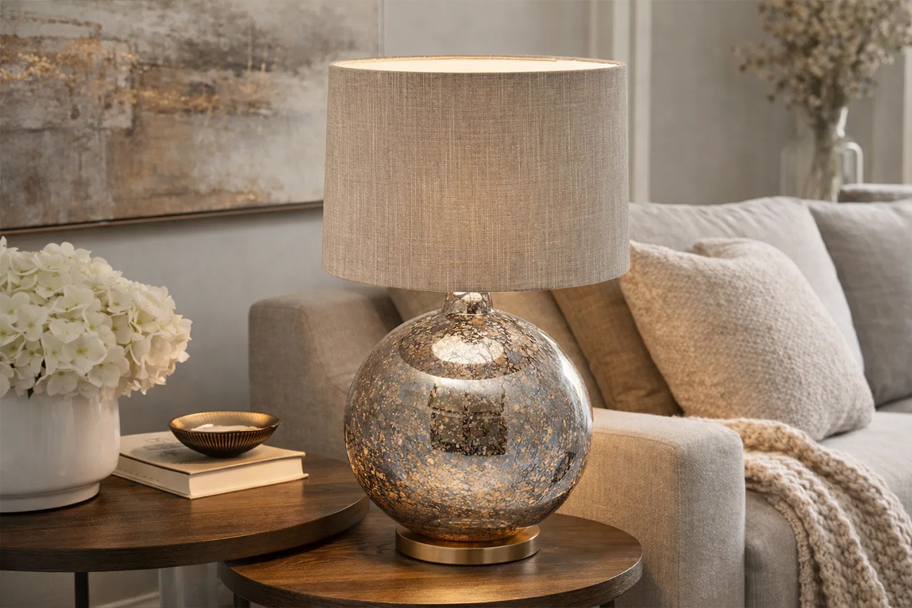 Стильная настольная лампа с бежевым абажуром – классическое решение для интерьеров, которые нуждаются в красивых функциональных вещах. Комбинация стеклянного основания круглой формы и тканевого абажура из натурального льна выглядит эффектно и добавляет ок...