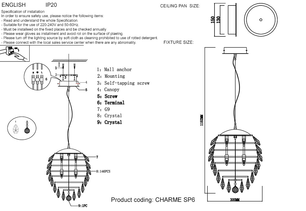Светильник подвесной Crystal Lux CHARME SP6 CHROME/TRANSPARENT CHARME SP6 CHROME/TRANSPARENT