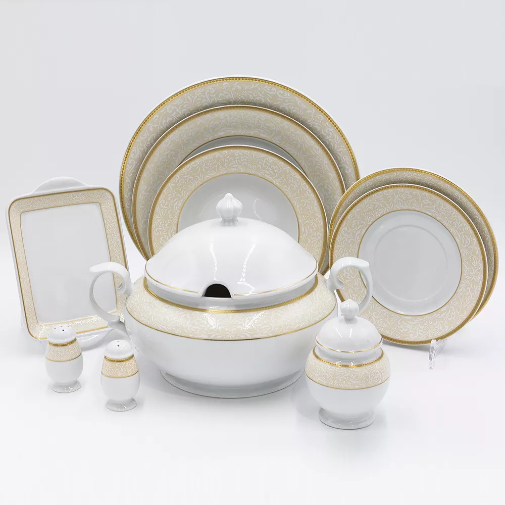 - Состав комплекта:: Супник 4,0 л – 1шт, тарелка суповая 22 см – 6шт, тарелка обеденная 27 см – 6шт, тарелка закусочная 21 см- 6шт, мармеладница – 1шт, селедочница 21х14 см -2шт, солонка – 1шт, перечница – 1шт, блюдо овальное 32х23,5 см – 1шт, блюдо круглое 30 см – 1шт, салатник круглый 21 см – 1шт, салатник круглый 24 см – 1 шт, соусник 0,45л – 1 шт, подставка под соусник 21,5 см – 1 шт.