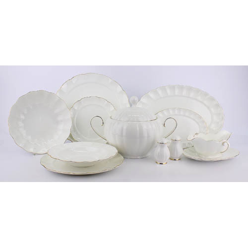 - Состав комплекта:: Супница - 1 шт, Крышка супницы - 1 шт, Тарелка суповая 23 см - 6 шт, Тарелка обеденная 27 см - 6 шт, Тарелка закусочная 21,5 см - 6 шт, Блюдо круглое 32 см - 1 шт, Блюдо овальное 24 см - 1 шт, Блюдо овальное 37 см - 1 шт, Соусник 450 мл – 1 шт, Подставка под соусник 23 см - 1 шт, Салатник круглый 23,5 см - 1 шт, Солонка 0,1 л - 1 шт , Перечница 0,1 л - 1 шт