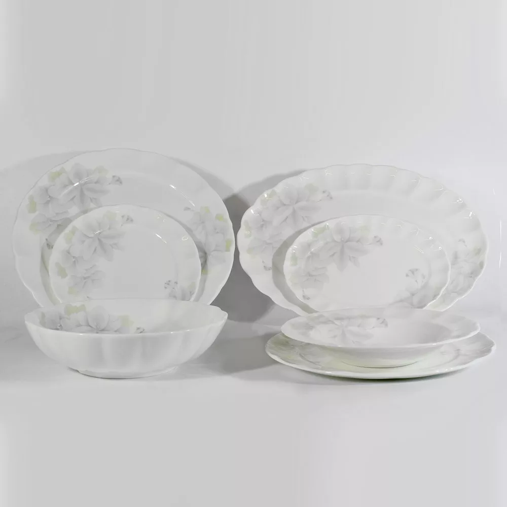 - Состав комплекта:: Тарелка обеденная 27 см - 6 шт, Тарелка закусочная 21,5 см - 6 шт, Тарелка суповая 23 см - 6 шт, Салатник 23,5 см - 1 шт, Блюдо круглое 32 см - 1 шт, Блюдо овальное 37 см - 1 шт, Блюдо овальное 24 см - 1 шт, Солонка 0,1 л – 1 шт, Перечница 0,1 л – 1 шт.
