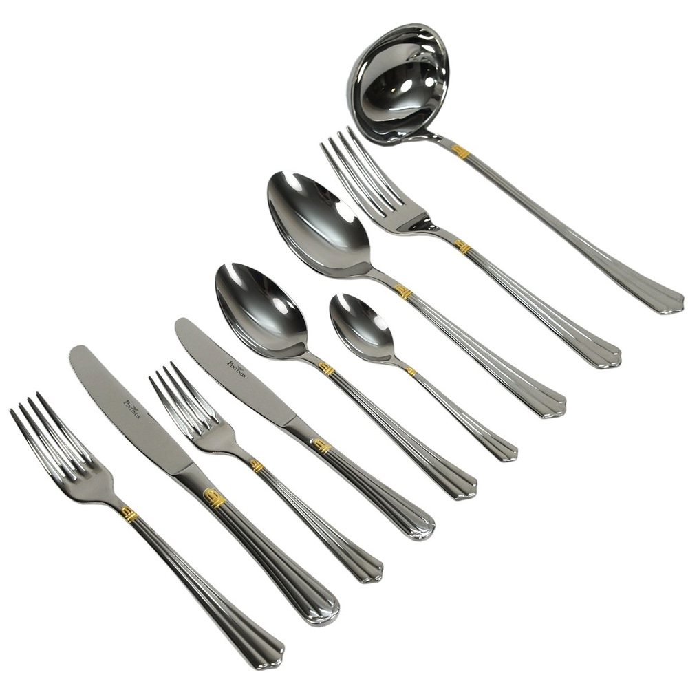 - Состав комплекта:: Нож столовый - 12 шт, вилка столовая - 12 шт, нож для закусок - 12 шт, вилка для закусок - 12 шт, ложка столовая - 12 шт, ложка чайная - 12 шт, половник - 1 шт, вилка сервировочная - 1 шт, ложка сервировочная - 1 шт.