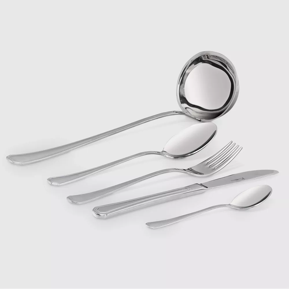 - Состав комплекта:: Столовый нож - 12 шт, столовая вилка - 12 шт, столовая ложка - 12 шт, чайная ложка - 12 шт, половник - 1 шт.
