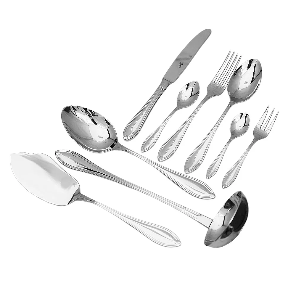 - Состав комплекта:: Состав набора: ложка столовая - 12 шт, вилка столовая - 12 шт, нож столовый - 12 шт, ложка чайная - 12 шт, ложка кофейная - 12 шт, вилка десертная - 12 шт, половник - 1 шт, ложка сервировочная - 1 шт, лопатка - 1 шт.