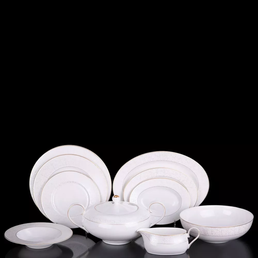 - Состав комплекта:: Тарелка суповая 21 см-6 шт, тарелка подстановочная 27,5 см-6 шт, тарелка 22 см-6 шт, блюдо овальное 23 см-1 шт, блюдо овальное 28 см-1 шт, блюдо овальное 35,5 см-1 шт, блюдо круглое 30,5 см-1 шт, салатник 25 см-1 шт, соусник 570 мл-1 шт.