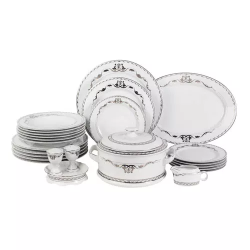 - Состав комплекта:: Супница 2,5 л-1 шт, блюдо круглое 30 см-1 шт, блюдо овальное 35 см-1 шт, тарелка суповая 22,5 см-6 шт, тарелка обеденная 25 см-6 шт, тарелка закусочная 19 см-6 шт, салатник 23 см-2 шт, солонка 6 см-1 шт, соусник 400 мл с подставкой-1 шт, подарочная кожаная коробка-1 шт.