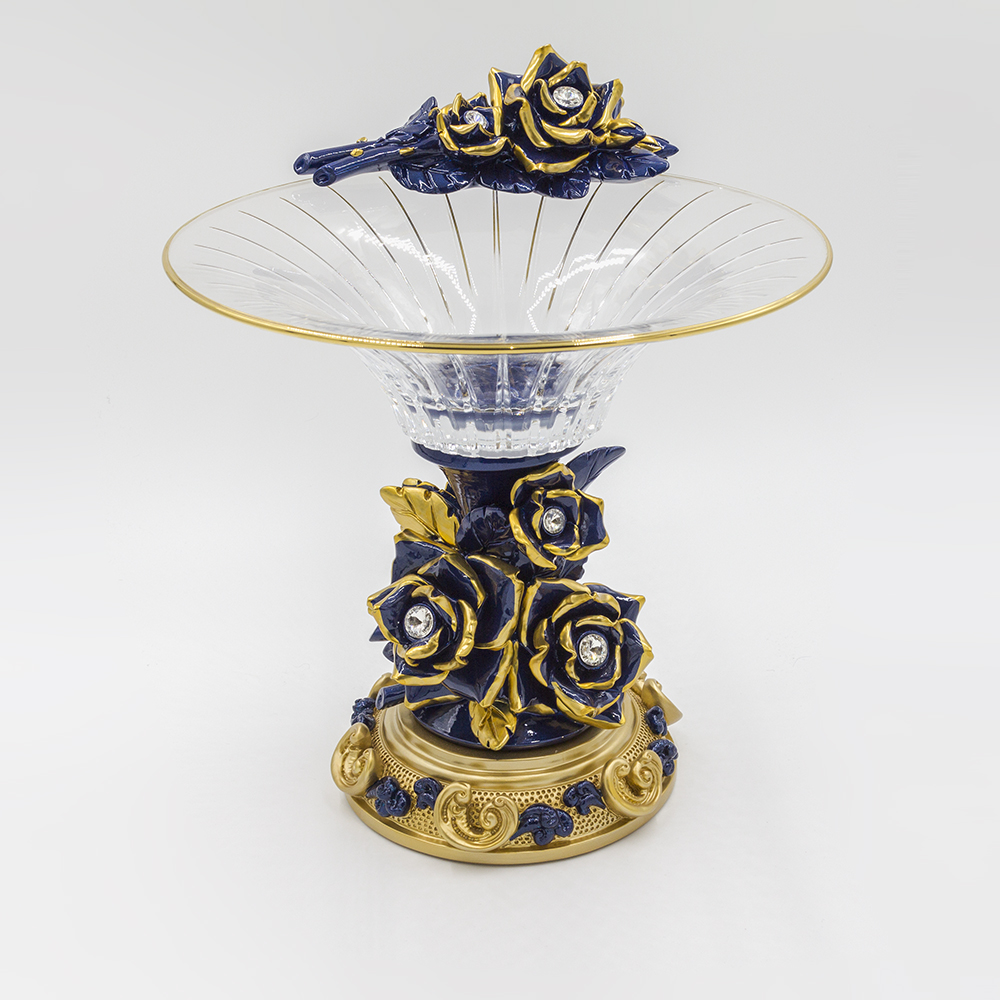 Ваза декоративная d32см, h30см, цветок на чаше, синяя/золото, Cevik