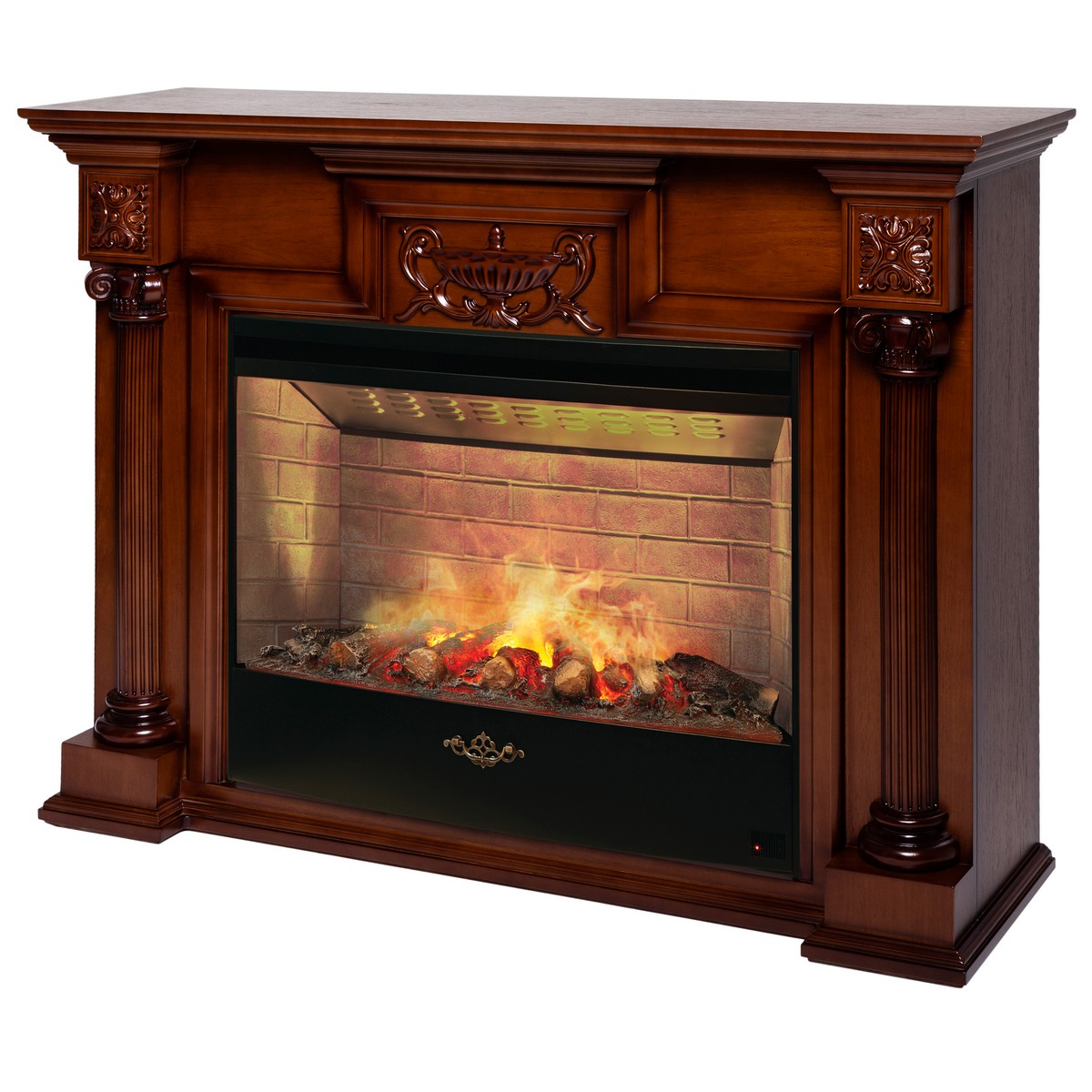 Широкоформатный очаг с самой реалистичной технологией пламени 3D. Эффект пламени, не отличимого от настоящего, создается ультразвуковым парогенератором, вырабатывающим холодный водяной пар и муляжом дров, подсвеченным галогеновыми лампами. Панорамная форма очага увеличивает угол обзора, звуковой эффект потрескивания поленьев и кирпичная кладка на стенках создают полное сходство с настоящим очагом.