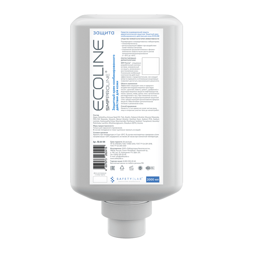 Название: Средство индивидуальной защиты дерматологическое, защитное:. Защитный крем комбинированного действия для кожи ECOLINE. Код по каталогу:. Категория направленной эффективности и дополнительные преимущества:. Средство – первой категории эффективности. - Гипоаллергенность средства подтверждена в аккредитованной лаборатории. - Подтверждено детоксицирующее действие в отношение нейтрализации солей тяжелых металлов. - Выдерживает 6 циклов замораживания/размораживания при температуре от – 45°С до + 40°С.. Состав: Aqua, Helianthus Annuus Seed Oil, Talc, Kaolin, Cetearyl Alcohol, Glyceryl Stearate, PEG-100 Stearate, Glycerin, Benzyl Alcohol, Xanthan Gum, Sodium PCA, Sodium Lactate, Hydroxyethyl Urea, Niacinamide, Panthenol, Sorbitol, Tocopherol, Ascorbyl Palmitate, Lecithin, Ethylhexylglycerin, Disodium EDTA, Aroma.. Применение: нанести крем (1-2 мл) на сухие чистые руки, лицо и открытые участки тела до начала работ. По окончании работ рекомендуется воспользоваться очищающими средствами и восстанавливающим кремом ECOLINE.. Средство сохраняет органолептические и физико-химические свойства при замораживании и нагревании от – 45°С до + 40°С... Меры предосторожности: Только для наружного применения, не наносить на раны и слизистую. В случае попадания в глаза, тщательно промыть их водой.. Хранение: хранить средство в упаковке изготовителя в крытых хорошо проветриваемых складских помещениях при температуре от 0 С до +25°С в соответствии с правилами хранения.Предохранять от воздействия прямых солнечных лучей и нагреваниясвыше + 40°С.. Транспортировка: транспортировка средства допускается всеми видами наземного транспорта в соответствии с правилами перевозки грузов, действующими на каждом виде транспорта и гарантирующими сохранность средства и тары.. Расход средства на одно применение: 1-2 мл.. Упаковка: мягкая бутыль, картридж, 2000мл.. Срок годности: 36 месяцев.. Соответствие продукции нормативным документам: ТР ТС 019/2011, ГОСТ 31460-2012, ГОСТ Р 12.4.301-2018 , ГОСТ Р 12.4.305-2021.