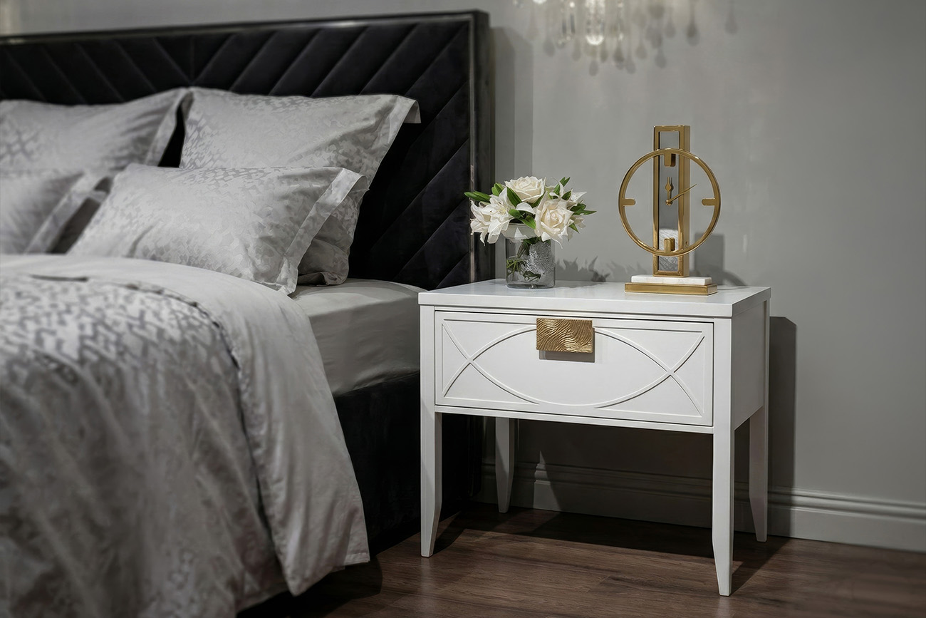 Дизайнерская тумбочка в стиле ар-деко - авторская разработка студии Garda Decor. Бежевый матовый фасад украшен объемным дугообразным декором и широкими рельефными ручками золотого цвета (матовое золото). Выдвижной ящик прекрасно подойдет для домашней апте...
