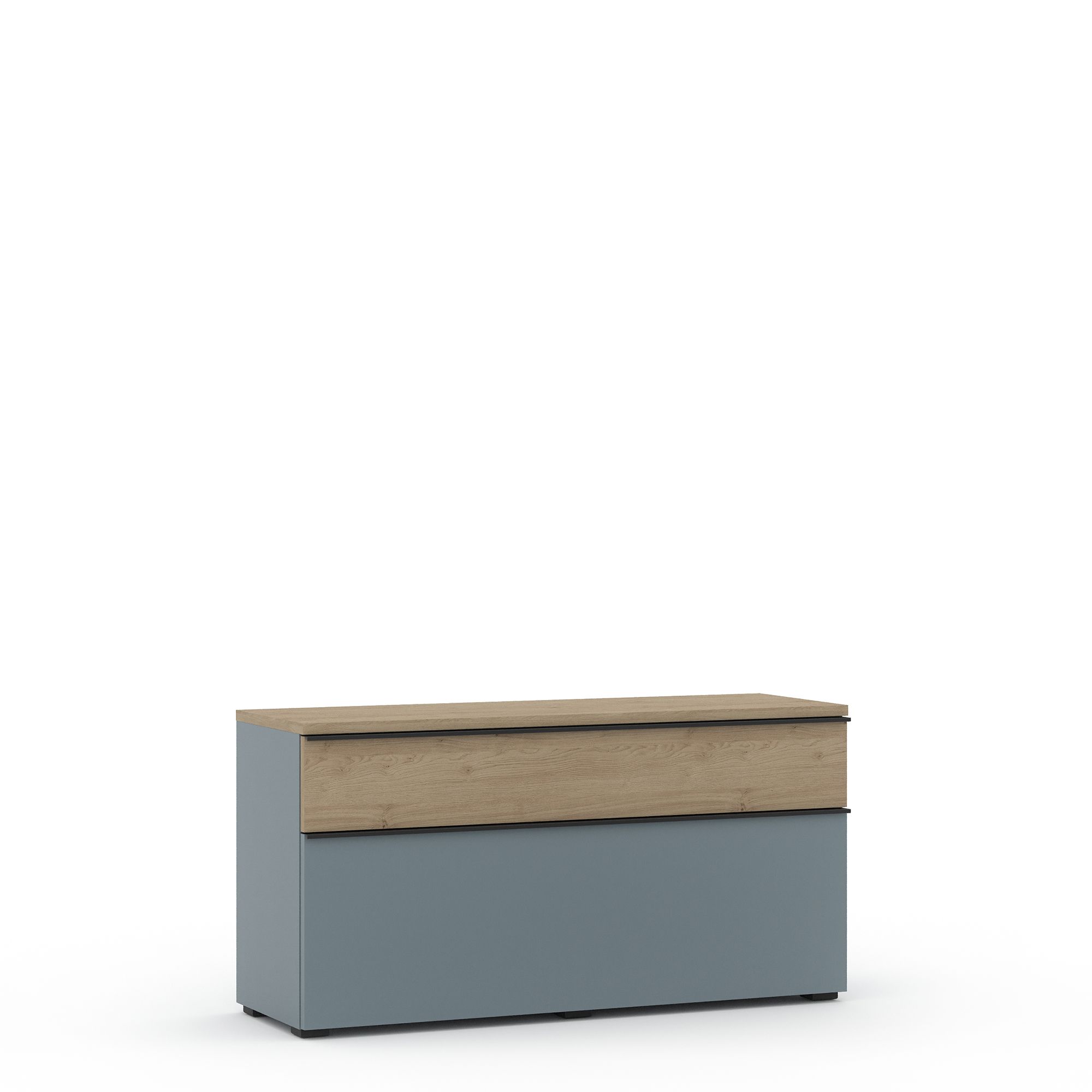 ТВ-тумба TERAMO с двумя выдвижными ящиками выполнена в сочетании древесной текстуры Дуб Кендал натуральный и монохромной отделки. Накладные ручки из алюминия с черным матовым покрытием входят в комплектацию.