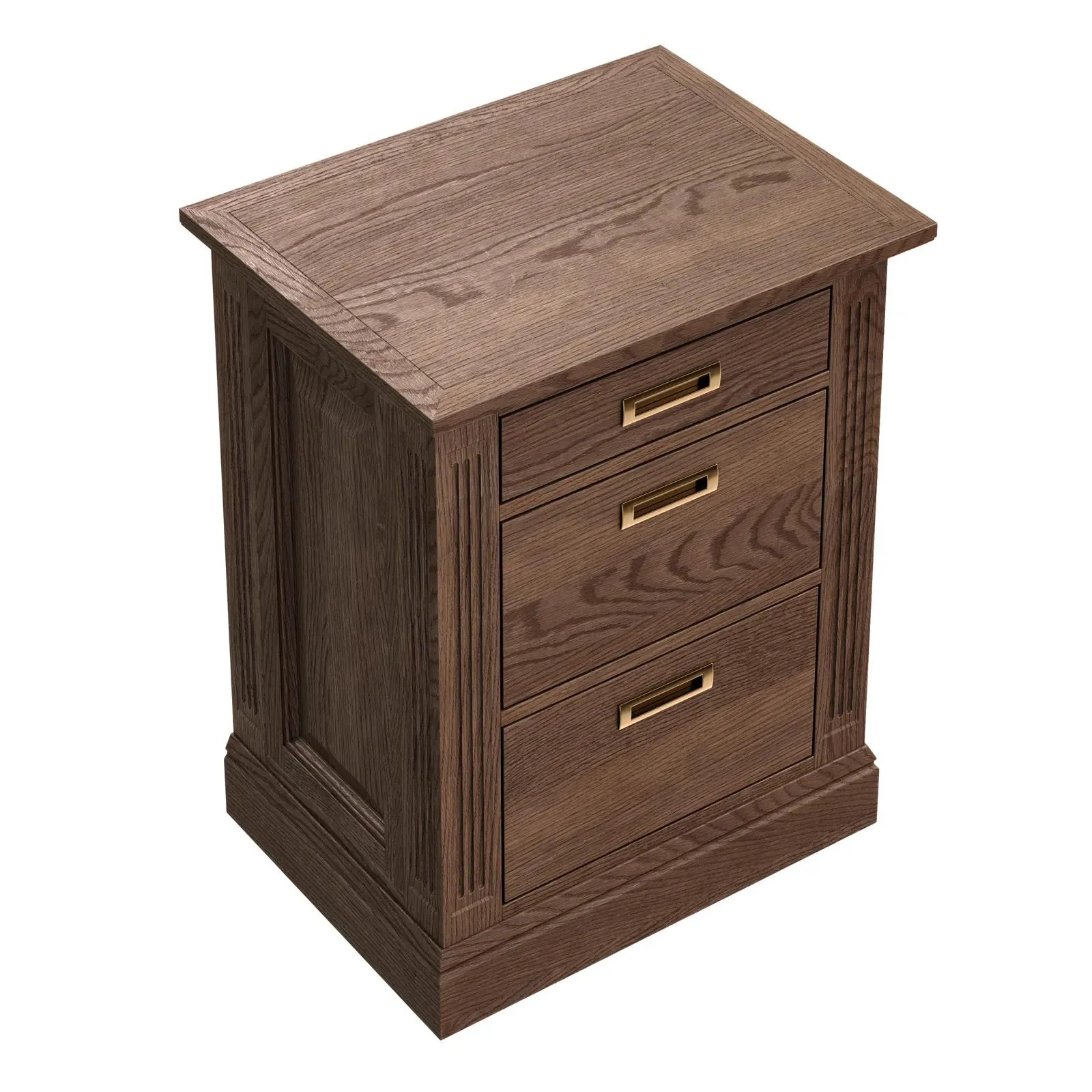 Прикроватная тумба с тремя выдвижными ящиками коллекции Timeless из шпона вяза в морилке черного цвета с сохранением фактуры дерева.