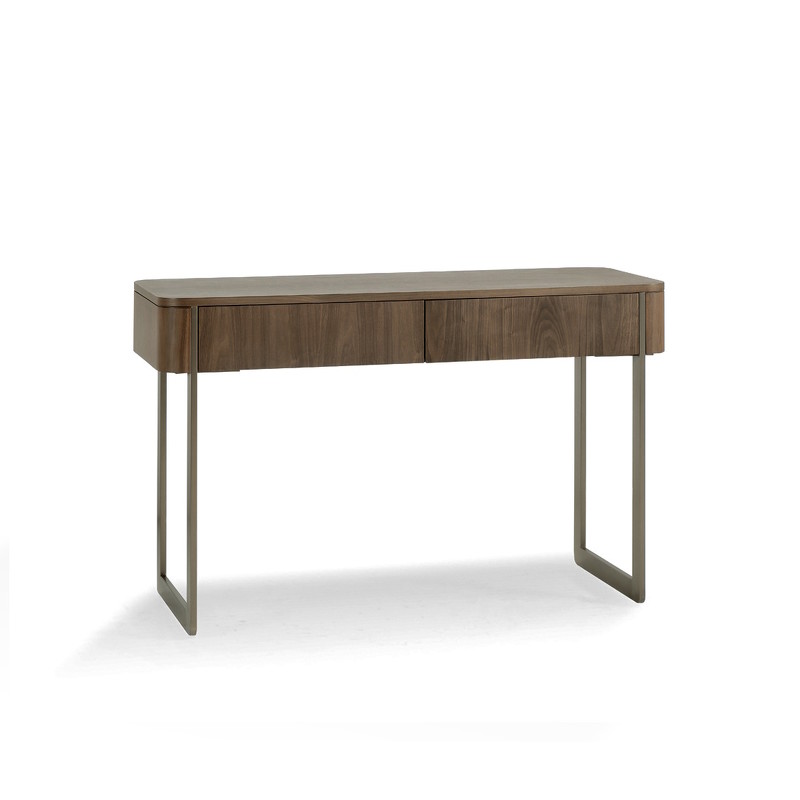 Выполнена в отделке шпоном американского ореха, оснащена двумя выдвижными ящиками.