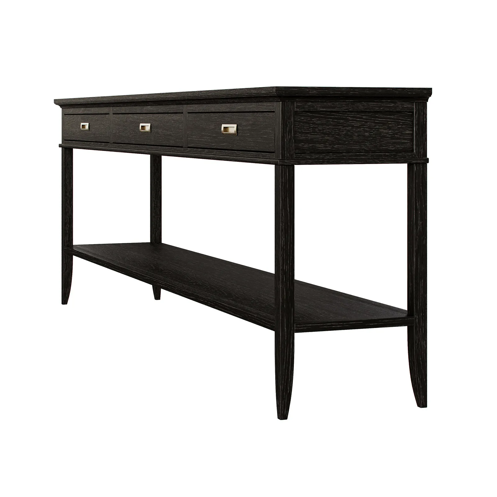 Консоль с двумя выдвижными ящиками и полкой, на 4-х опорах коллекции Timeless из шпона вяза в морилке черного цвета с сохранением фактуры дерева.
