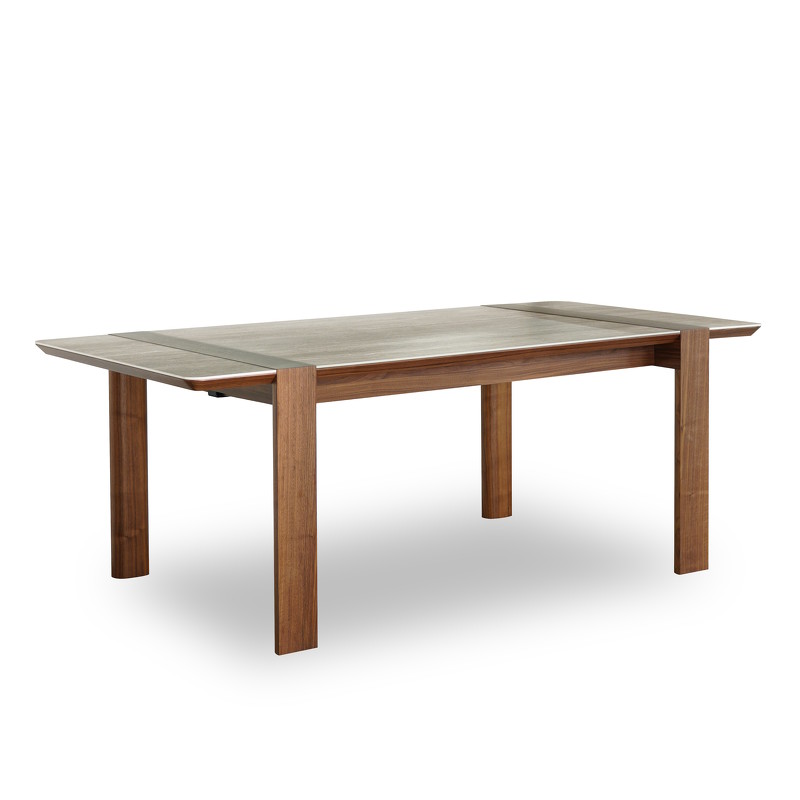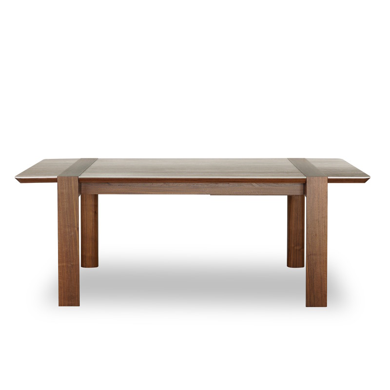 Основание стола выполнено в отделке шпоном, столешница - керамика, с вставками в шпоне. Стол раздвижной, оснащен дополнительной вставкой 50 см. В разложенном виде стол составляет 254 см, благодаря чему, за столом можно разместить большое количество гостей.